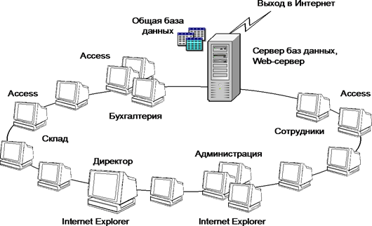 Корпоративные сети являются сетями уровня предприятия, которые базируются на клиент-серверных и интернет-технологиях. Эти сети мо- гут подключаться или не подключаться к Интернету (рис. 19). Техноло- гии Интернета позволяют получить доступ к информации всего предпри- ятия со своего рабочего места, не заботясь о совместимости аппарат- ных и программных платформ, используя обычную программу просмот- ра – обозреватель Internet Explorer.