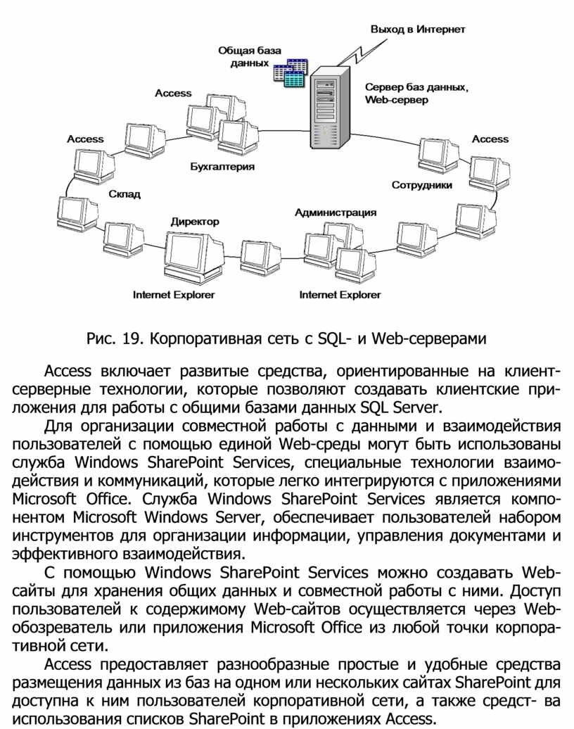 С помощью Windows SharePoint Services можно создавать Web- сайты для хранения общих данных и совместной работы с ними. Доступ пользователей к содержимому Web-сайтов осуществляется через Web- обозреватель или приложения Microsoft Office из любой точки корпора- тивной сети.