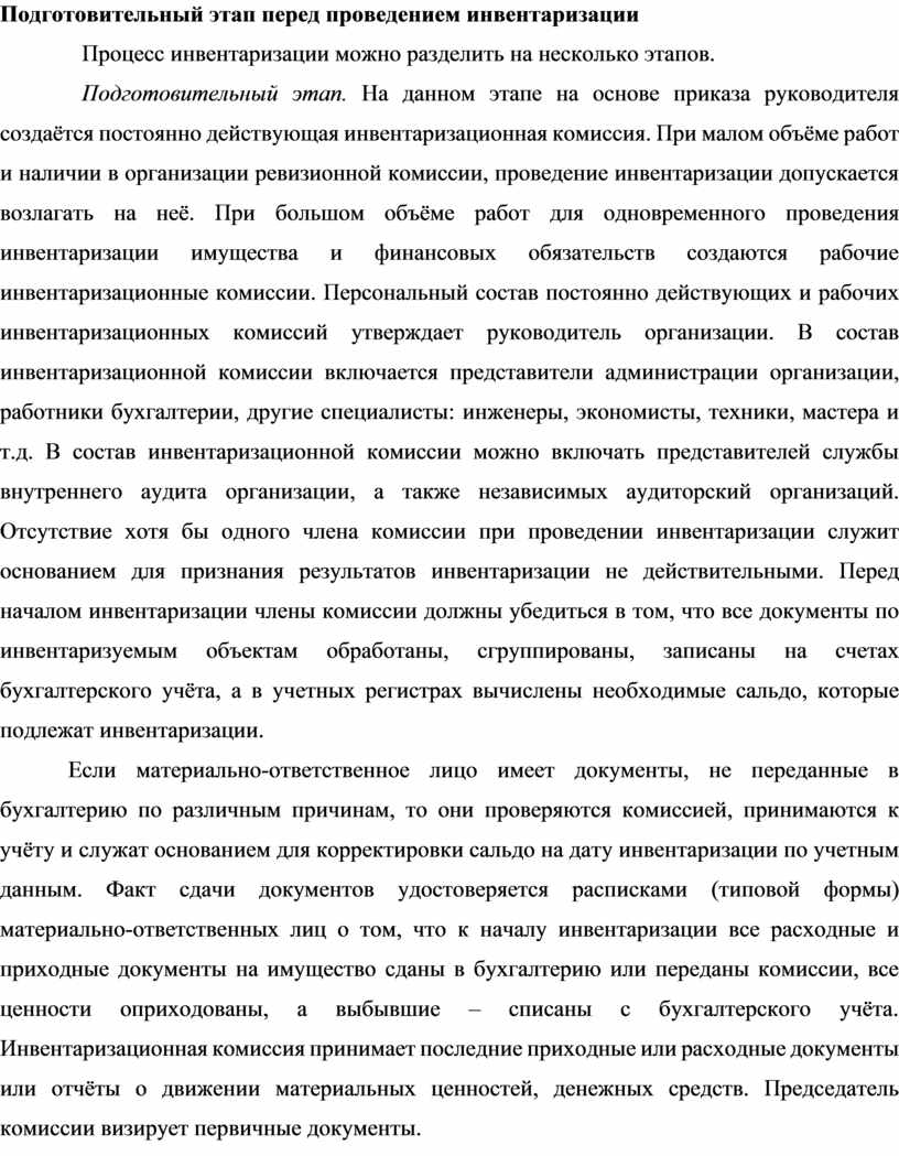 Подготовительный этап. На данном этапе на основе приказа руководителя создаётся постоянно действующая инвентаризационная комиссия. При малом объёме работ и наличии в организации ревизионной комиссии, проведение инвентаризации допускается возлагать на неё. При большом объёме работ для одновременного проведения инвентаризации имущества и финансовых обязательств создаются рабочие инвентаризационные комиссии. Персональный состав постоянно действующих и рабочих инвентаризационных комиссий утверждает руководитель организации. В состав инвентаризационной комиссии включается представители администрации организации, работники бухгалтерии, другие специалисты: инженеры, экономисты, техники, мастера и т.д. В состав инвентаризационной комиссии можно включать представителей службы внутреннего аудита организации, а также независимых аудиторский организаций. Отсутствие хотя бы одного члена комиссии при проведении инвентаризации служит основанием для признания результатов инвентаризации не действительными. Перед началом инвентаризации члены комиссии должны убедиться в том, что все документы по инвентаризуемым объектам обработаны, сгруппированы, записаны на счетах бухгалтерского учёта, а в учетных регистрах вычислены необходимые сальдо, которые подлежат инвентаризации.