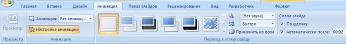 · Далее следует выбрать понравившейся эффект перехода, звук к нему и скорость процесса. Также настраивается автоматический переход (тогда задается его время) и по клику мышки. Переход можно сделать для каждого слайда отдельно, а можно настроить сразу для всей презентации.