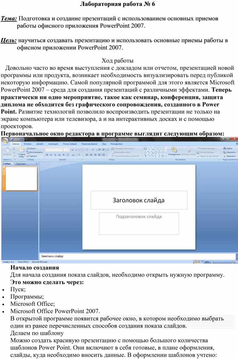 Цель: научиться создавать презентацию и использовать основные приемы работы в офисном приложении PowerPoint 2007.
