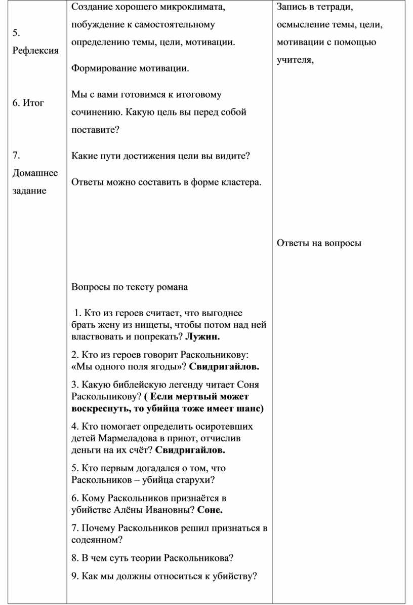 Вопросы по тексту романа 1. Кто из героев считает, что выгоднее брать жену из нищеты, чтобы потом над ней властвовать и попрекать? Лужин. 2. Кто из героев говорит Раскольникову: «Мы одного поля ягоды»? Свидригайлов. 3. Какую библейскую легенду читает Соня Раскольникову? ( Если мертвый может воскреснуть, то убийца тоже имеет шанс) 4. Кто помогает определить осиротевших детей Мармеладова в приют, отчислив деньги на их счёт? Свидригайлов. 5. Кто первым догадался о том, что Раскольников – убийца старухи? 6. Кому Раскольников признаётся в убийстве Алёны Ивановны? Соне. 7. Почему Раскольников решил признаться в содеянном? 8. В чем суть теории Раскольникова? 9. Как мы должны относиться к убийству? 10. Может ли современный человек оказаться в таких же условиях, что и Раскольников? 11. Как созревала у Раскольникова идея убийства? Какие эпизоды из жизни укрепили его намерения убить?