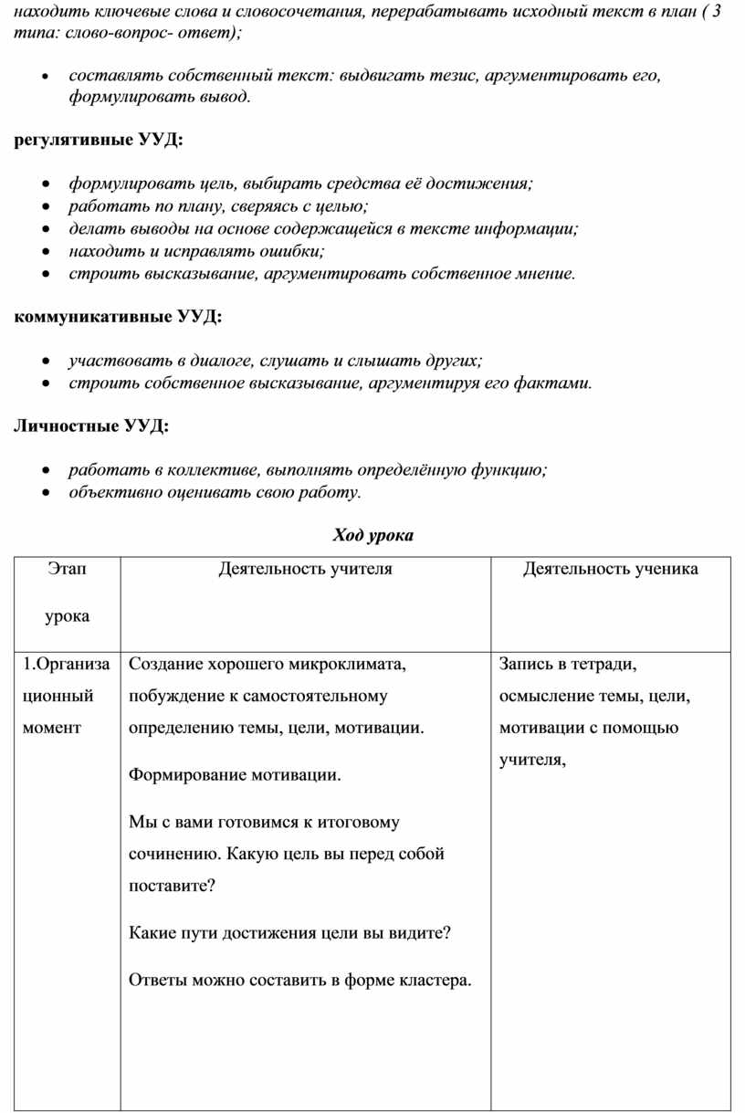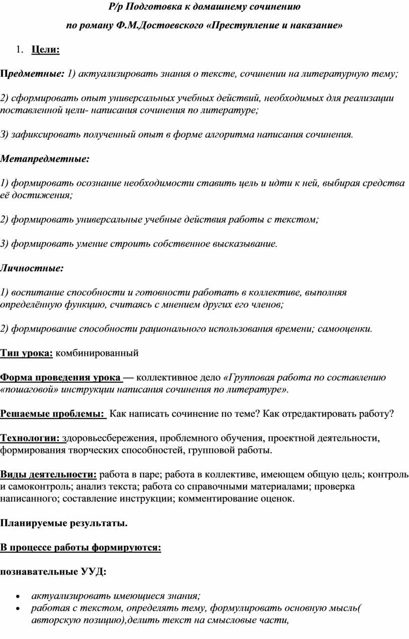 2) сформировать опыт универсальных учебных действий, необходимых для реализации поставленной цели- написания сочинения по литературе;