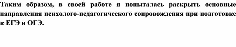 Таким образом, в своей работе я попыталась раскрыть основные направления психолого-педагогического сопровождения при подготовке к ЕГЭ и ОГЭ.