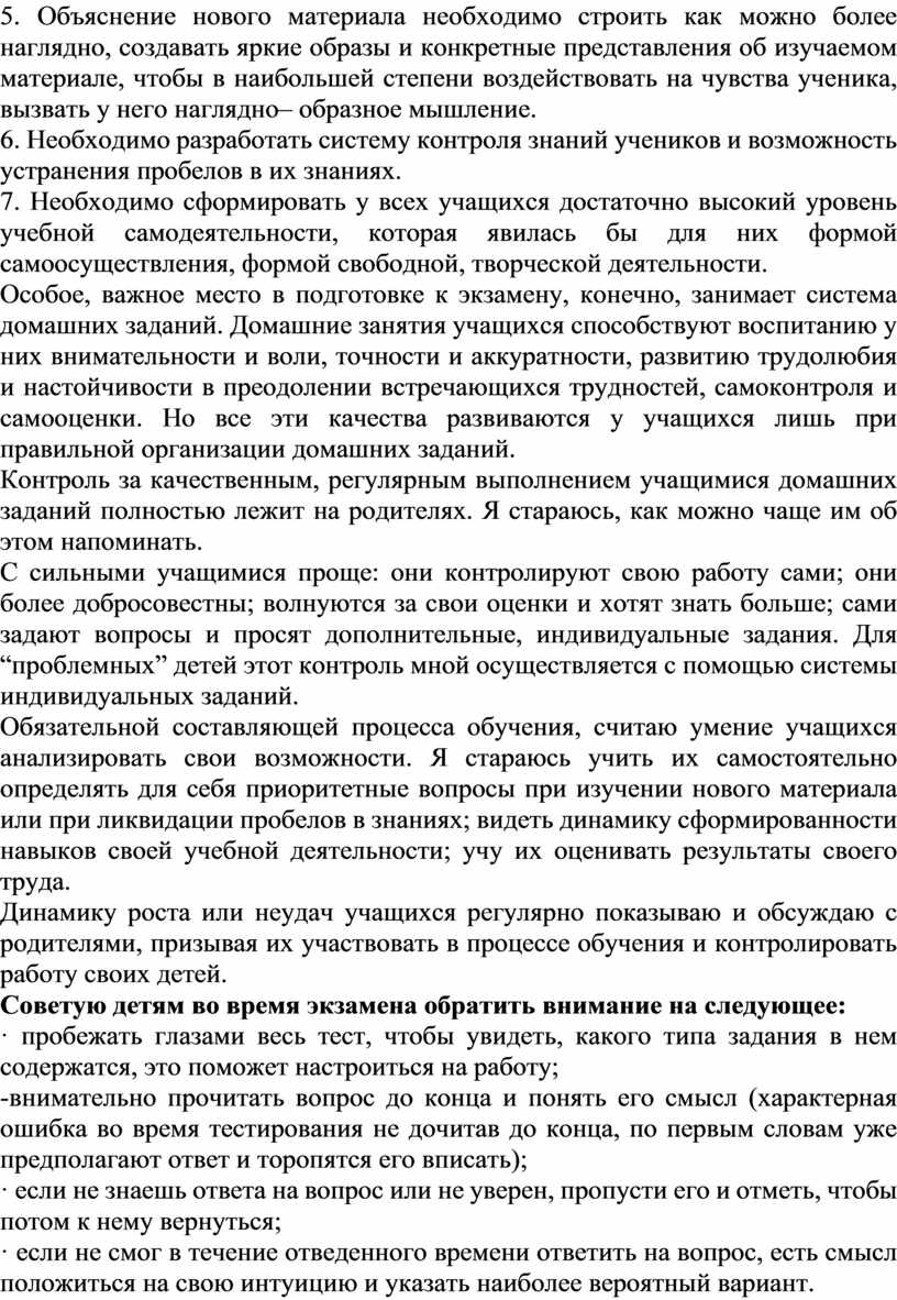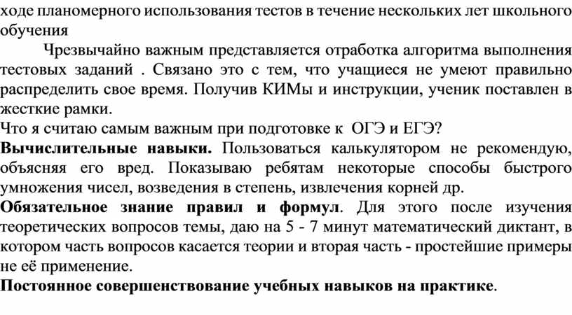 Опыт реализации ЕГЭ и ОГЭ подсказал, что подготовка к нему не должна быть самоцелью (школа призвана учить, а не готовить к сдаче экзамена), но в то же время проходить постоянно, но не натаскиванием на тестирование, а в ходе планомерного использования тестов в течение нескольких лет школьного обучения