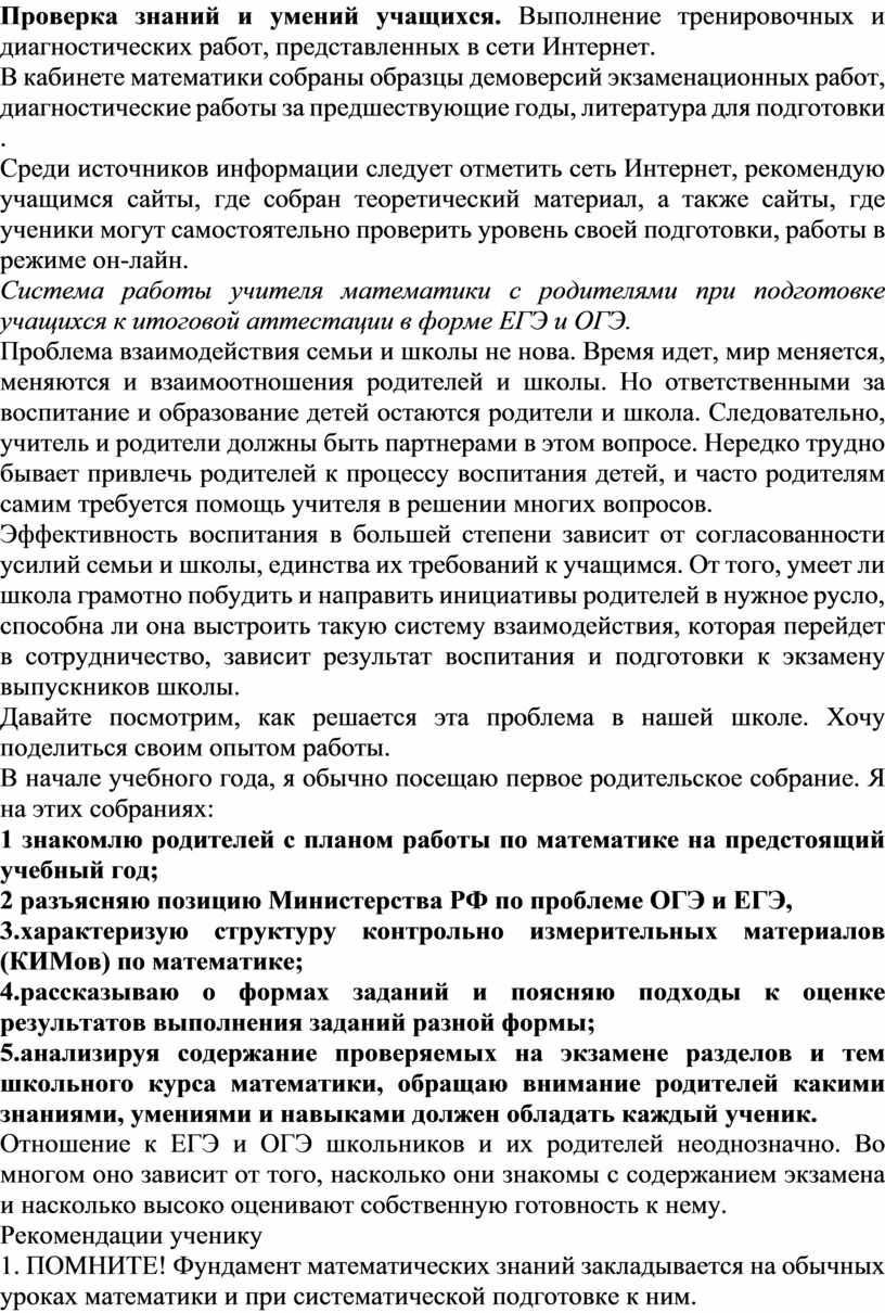 Система работы учителя математики с родителями при подготовке учащихся к итоговой аттестации в форме ЕГЭ и ОГЭ.