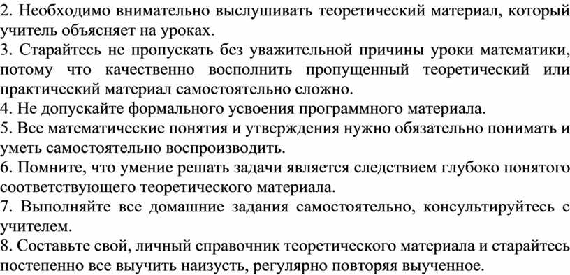 3. Старайтесь не пропускать без уважительной причины уроки математики, потому что качественно восполнить пропущенный теоретический или практический материал самостоятельно сложно.
