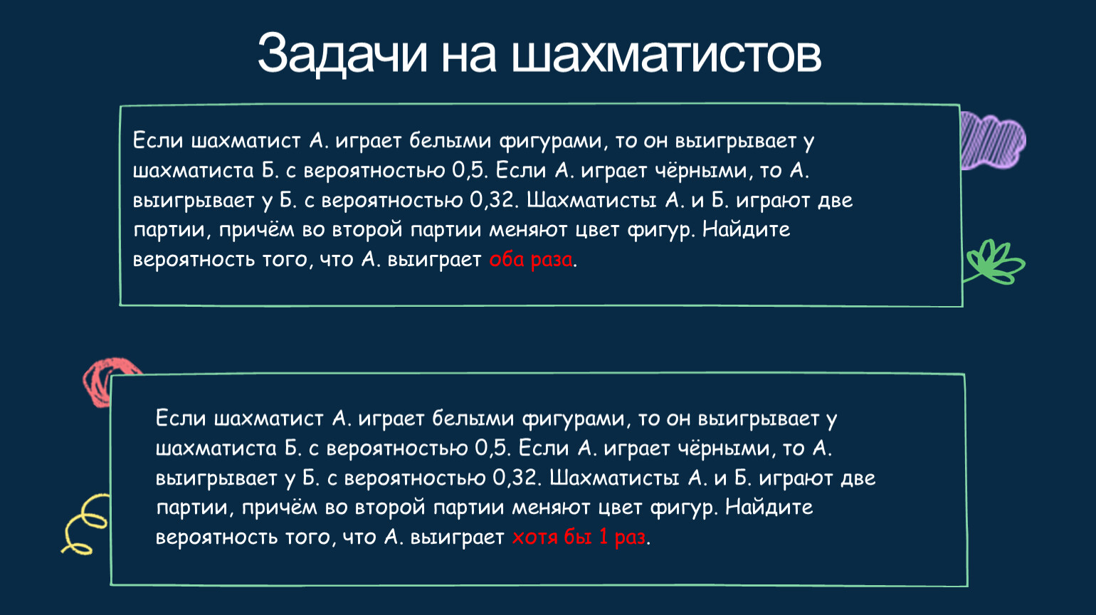 Если шахматист А. играет белыми фигурами, то он выигрывает у шахматиста Б. с вероятностью 0,5. Если А. играет чёрными, то А. выигрывает у Б. с вероятностью 0,32. Шахматисты А. и Б. играют две партии, причём во второй партии меняют цвет фигур. Найдите вероятность того, что А. выиграет оба раза.