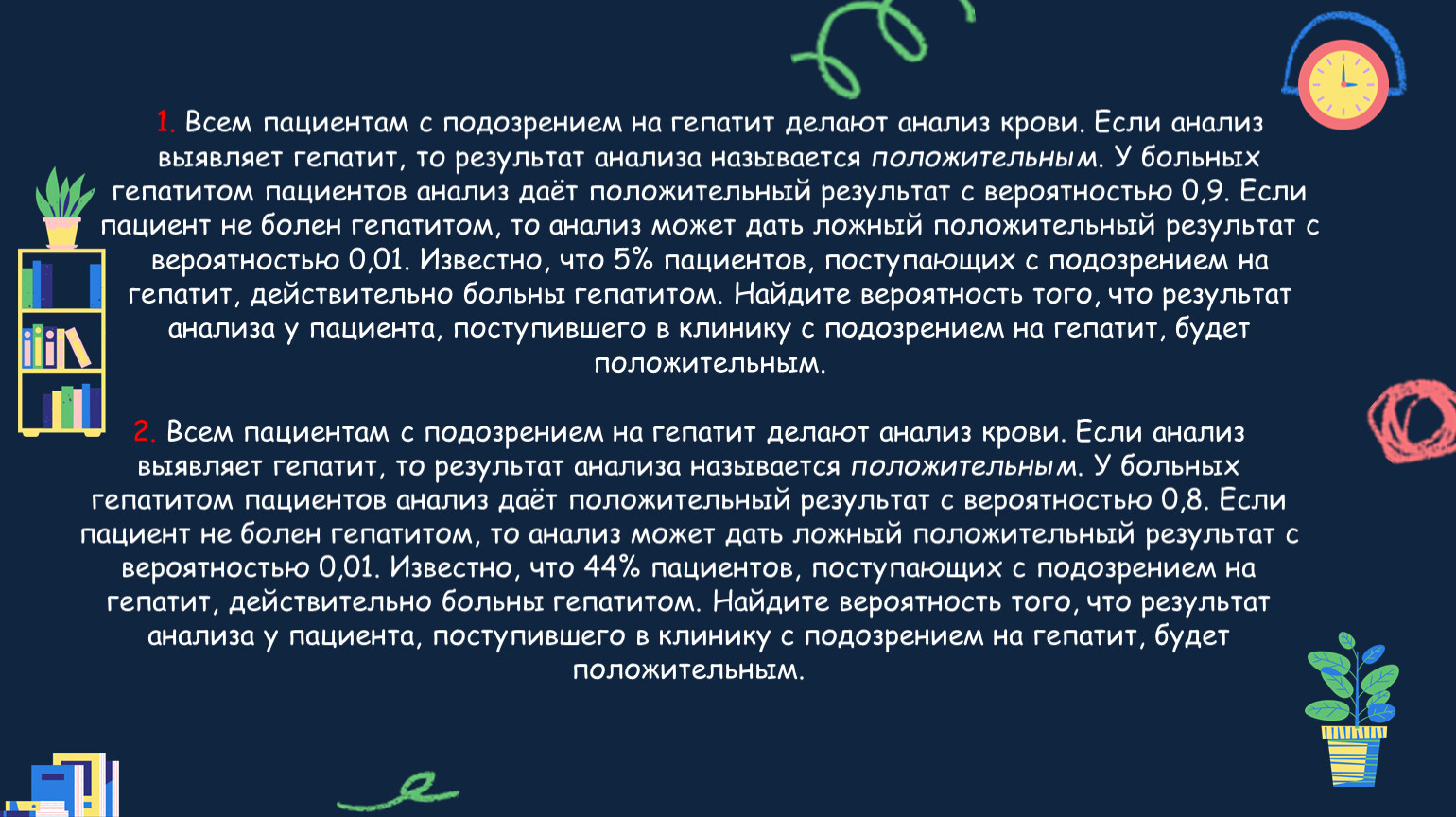 1. Всем пациентам с подозрением на гепатит делают анализ крови. Если анализ выявляет гепатит, то результат анализа называется положительным. У больных гепатитом пациентов анализ даёт положительный результат с вероятностью 0,9. Если пациент не болен гепатитом, то анализ может дать ложный положительный результат с вероятностью 0,01. Известно, что 5% пациентов, поступающих с подозрением на гепатит, действительно больны гепатитом. Найдите вероятность того, что результат анализа у пациента, поступившего в клинику с подозрением на гепатит, будет положительным.