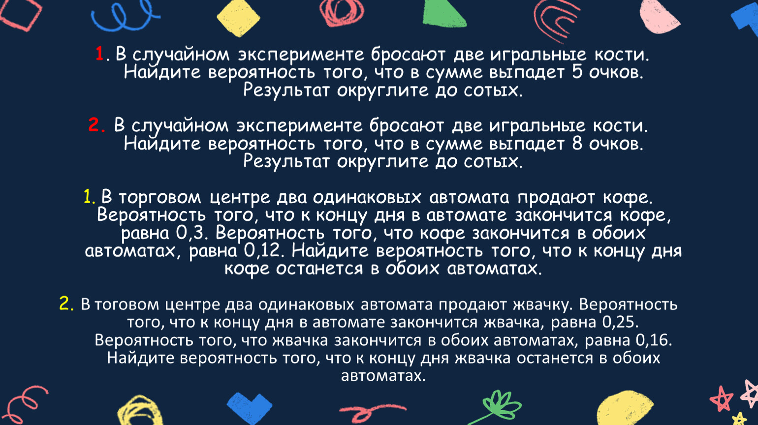 1. В торговом центре два одинаковых автомата продают кофе. Вероятность того, что к концу дня в автомате закончится кофе, равна 0,3. Вероятность того, что кофе закончится в обоих автоматах, равна 0,12. Найдите вероятность того, что к концу дня кофе останется в обоих автоматах.