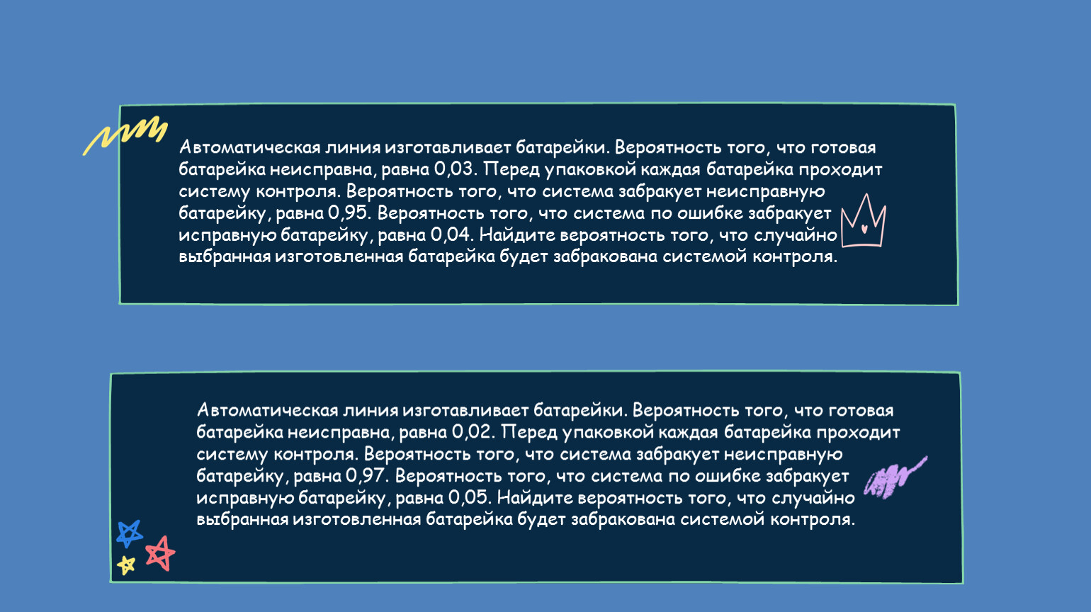 Автоматическая линия изготавливает батарейки. Вероятность того, что готовая батарейка неисправна, равна 0,02. Перед упаковкой каждая батарейка проходит систему контроля. Вероятность того, что система забракует неисправную батарейку, равна 0,97. Вероятность того, что система по ошибке забракует исправную батарейку, равна 0,05. Найдите вероятность того, что случайно выбранная изготовленная батарейка будет забракована системой контроля.