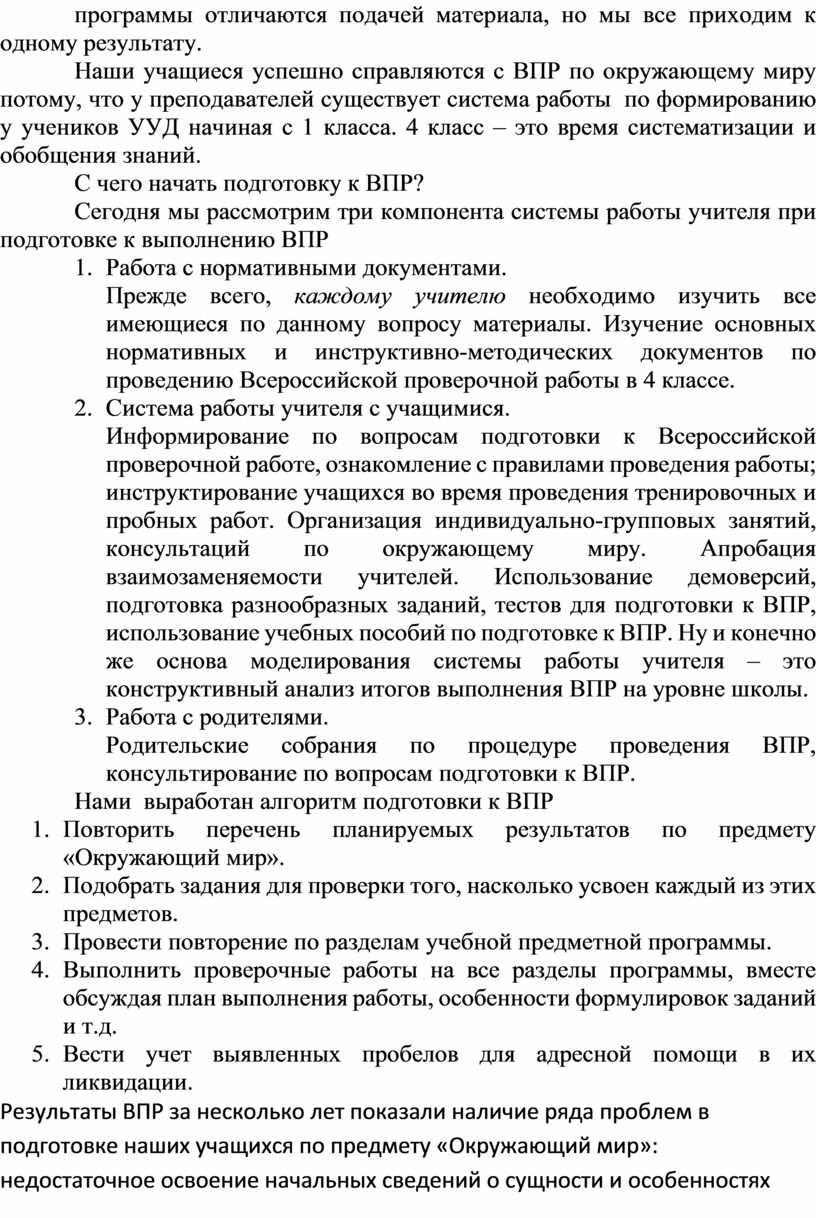 Важно понимать, что подготовка к ВПР – это целенаправленный труд педагога и родителей по освоению обучающимися предметных и метапредметных результатов образования в период всего обучения в начальной школе.