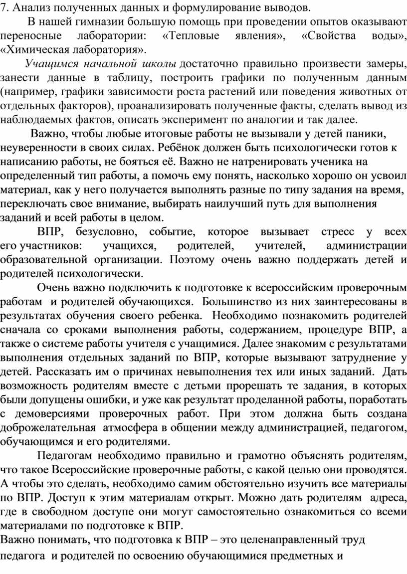 Очень важно подключить к подготовке к всероссийским проверочным работам и родителей обучающихся. Большинство из них заинтересованы в результатах обучения своего ребенка. Необходимо познакомить родителей сначала со сроками выполнения работы, содержанием, процедуре ВПР, а также о системе работы учителя с учащимися. Далее знакомим с результатами выполнения отдельных заданий по ВПР, которые вызывают затруднение у детей. Рассказать им о причинах невыполнения тех или иных заданий. Дать возможность родителям вместе с детьми прорешать те задания, в которых были допущены ошибки, и уже как результат проделанной работы, поработать с демоверсиями проверочных работ. При этом должна быть создана доброжелательная атмосфера в общении между администрацией, педагогом, обучающимся и его родителями.
