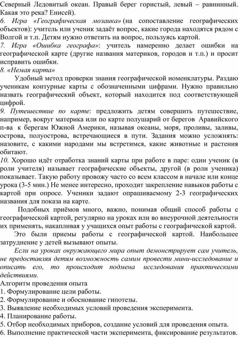 Это были приемы работы с географической картой. Наибольшее затруднение у детей вызывают опыты.
