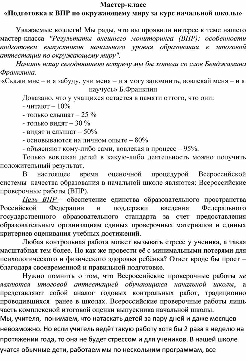 Уважаемые коллеги! Мы рады, что вы проявили интерес к теме нашего мастер-класса "Результаты внешнего мониторинга (ВПР): особенности подготовки выпускников начального уровня образования к итоговой аттестации по окружающему миру".