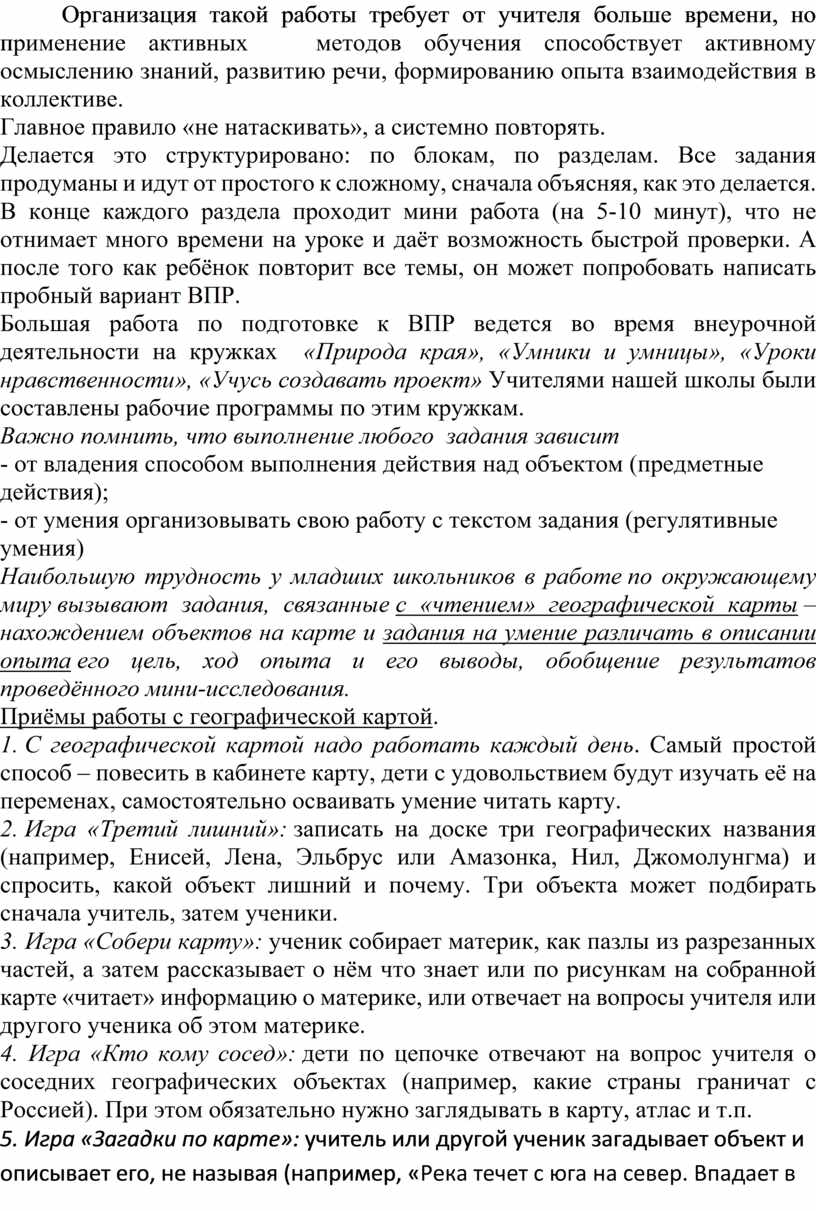 Подобных приёмов много, важно, понимая общий способ работы с географической картой, регулярно на уроках или во внеурочной деятельности их применять, накапливая у учащихся опыт работы с географической картой.