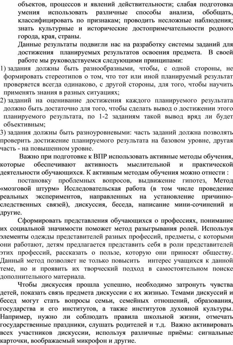 Результаты ВПР за несколько лет показали наличие ряда проблем в подготовке наших учащихся по предмету «Окружающий мир»: недостаточное освоение начальных сведений о сущности и особенностях объектов, процессов и явлений действительности; слабая подготовка умения использовать различные способы анализа, обобщать, классифицировать по признакам; проводить несложные наблюдения; знать культурные и исторические достопримечательности родного города, края, страны.