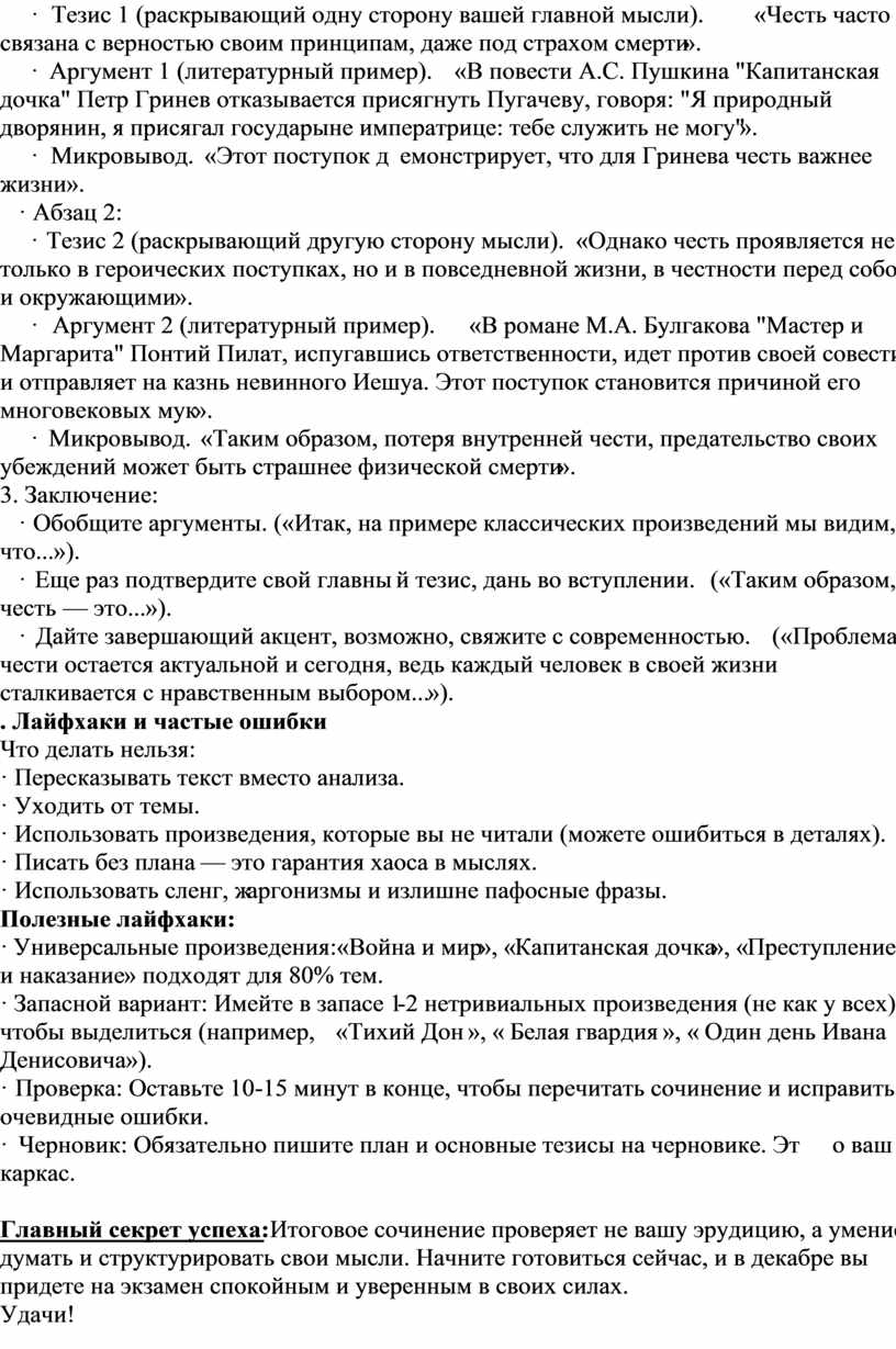· Четко сформулируйте свой тезис-ответ на вопрос темы. («Я считаю, что честь — это нравственный стержень человека, который помогает ему оставаться верным себе даже в самых сложных ситуациях»).