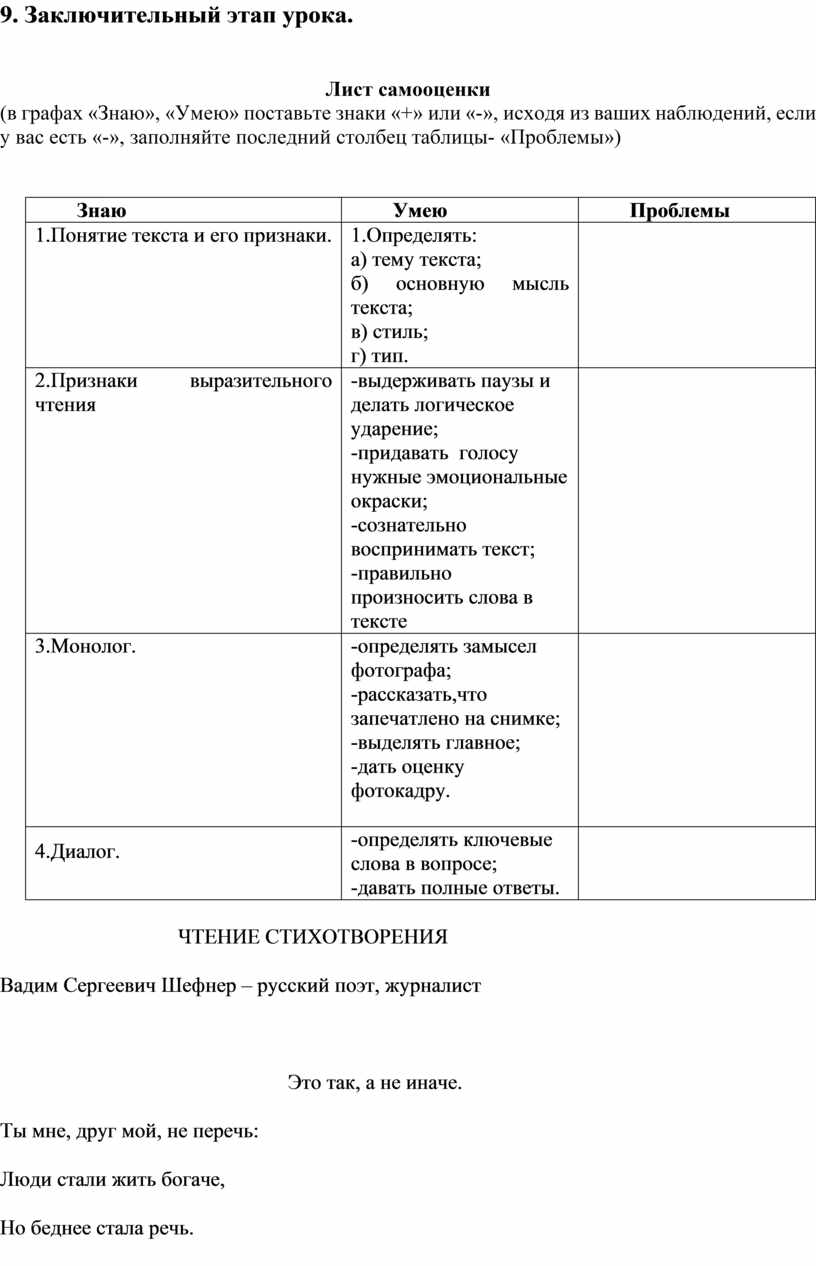 (в графах «Знаю», «Умею» поставьте знаки «+» или «-», исходя из ваших наблюдений, если у вас есть «-», заполняйте последний столбец таблицы- «Проблемы»)