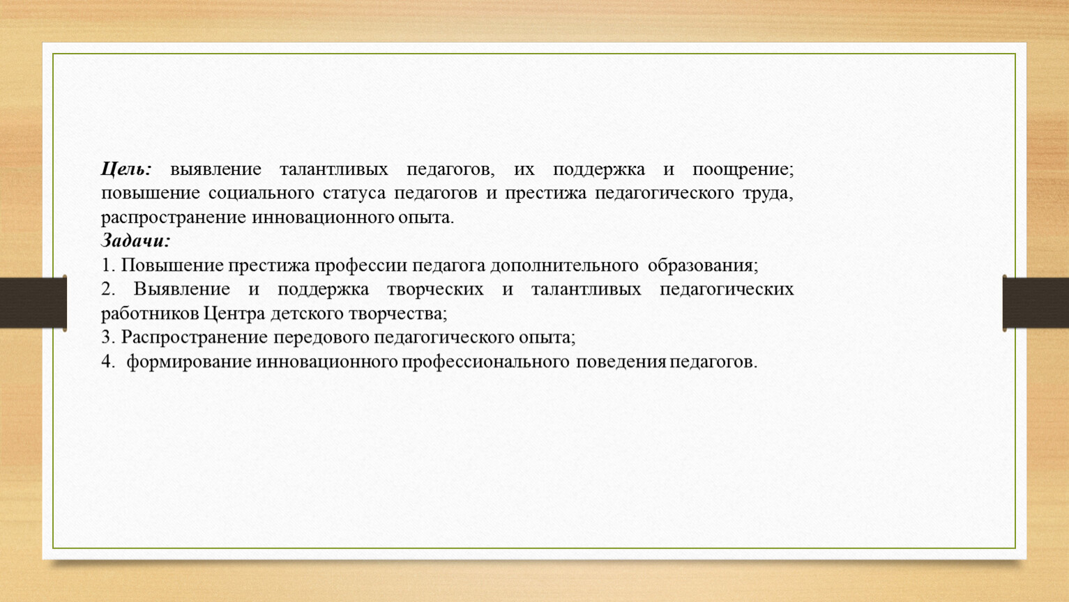 Цель: выявление талантливых педагогов, их поддержка и поощрение; повышение социального статуса педагогов и престижа педагогического труда, распространение инновационного опыта.