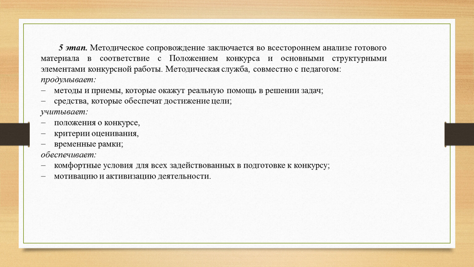 5 этап. Методическое сопровождение заключается во всестороннем анализе готового материала в соответствие с Положением конкурса и основными структурными элементами конкурсной работы. Методическая служба, совместно с педагогом: