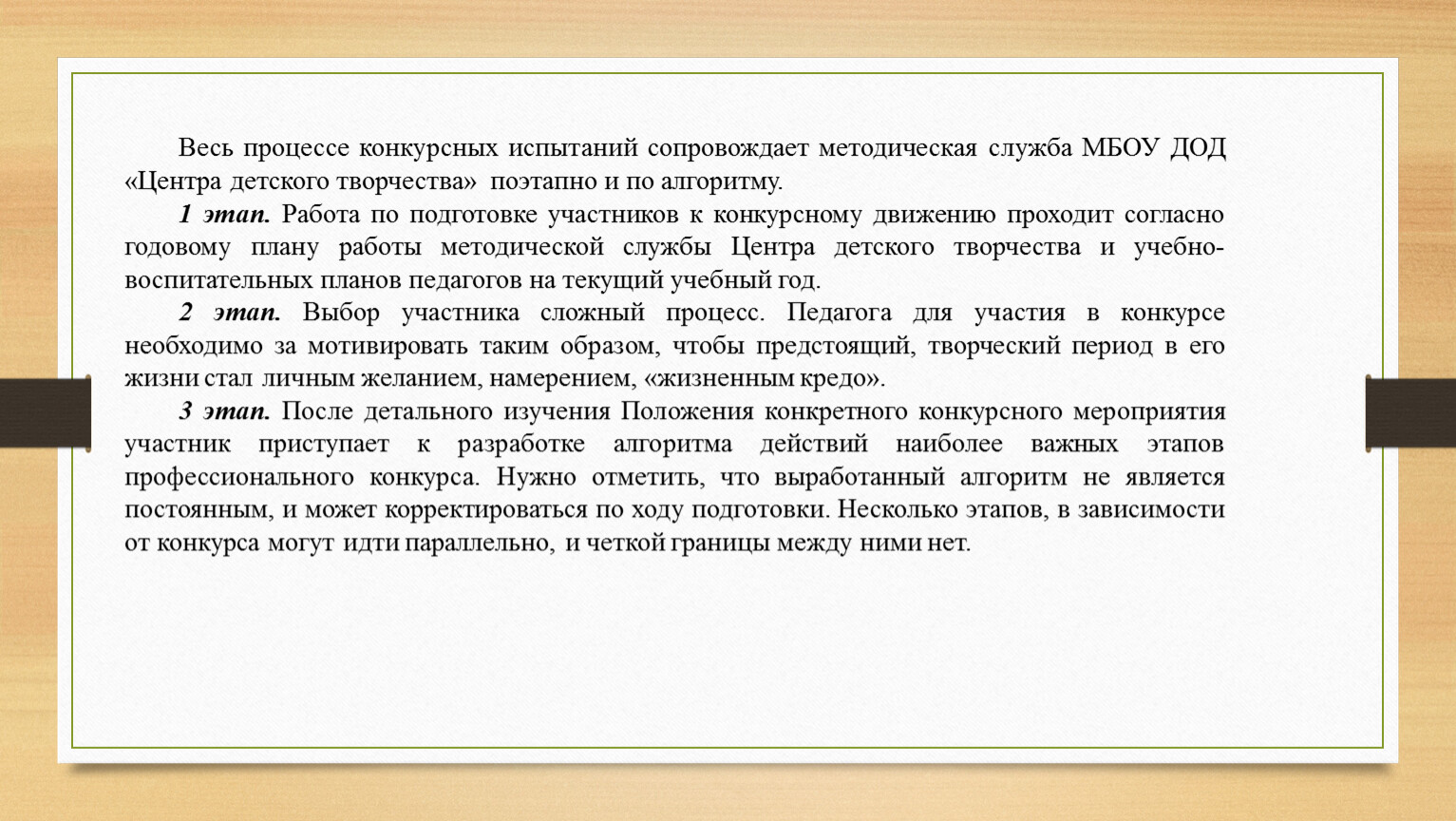 Весь процессе конкурсных испытаний сопровождает методическая служба МБОУ ДОД «Центра детского творчества» поэтапно и по алгоритму.