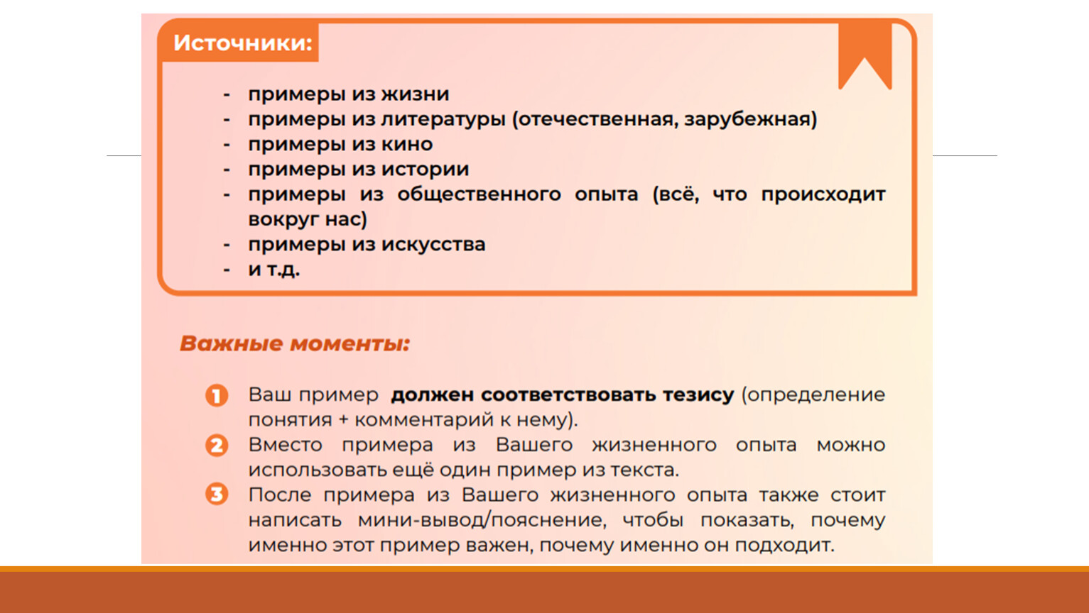 | Экзаменуемый привёл два примера: один пример из прочитанного текста, а другой – из жизненного опыта,илиэкзаменуемый привёл два примера из прочитанного текста | 3 |