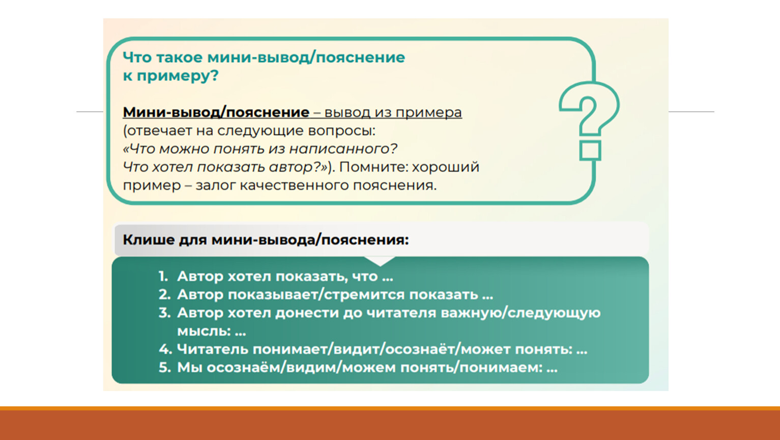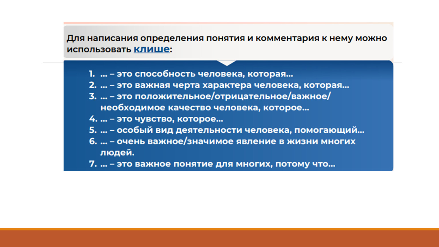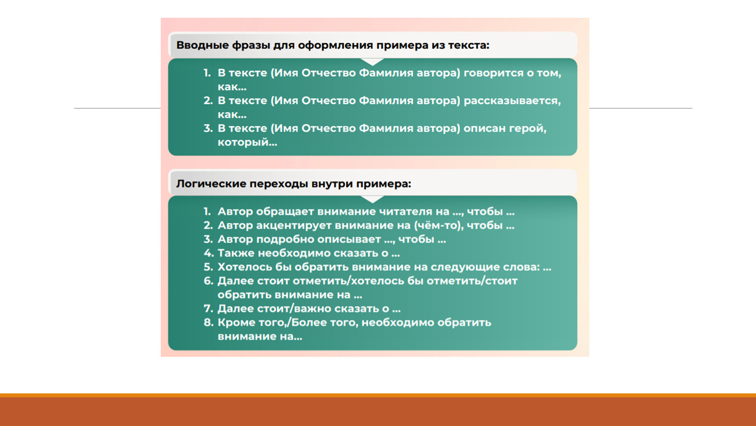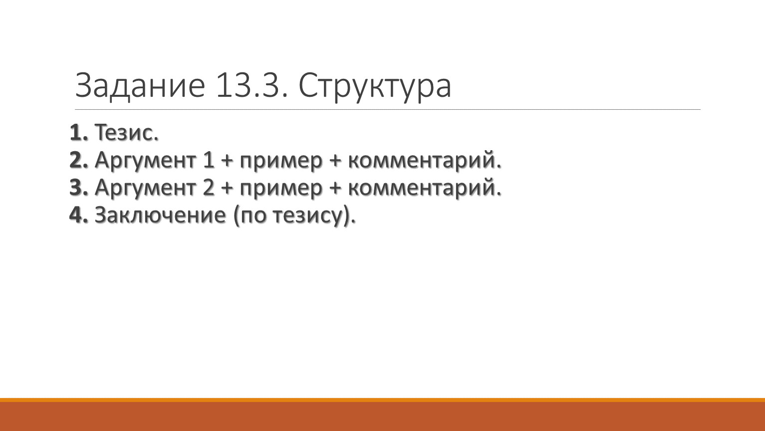 1. Тезис.2. Аргумент 1 + пример + комментарий.3. Аргумент 2 + пример + комментарий.4. Заключение (по тезису).