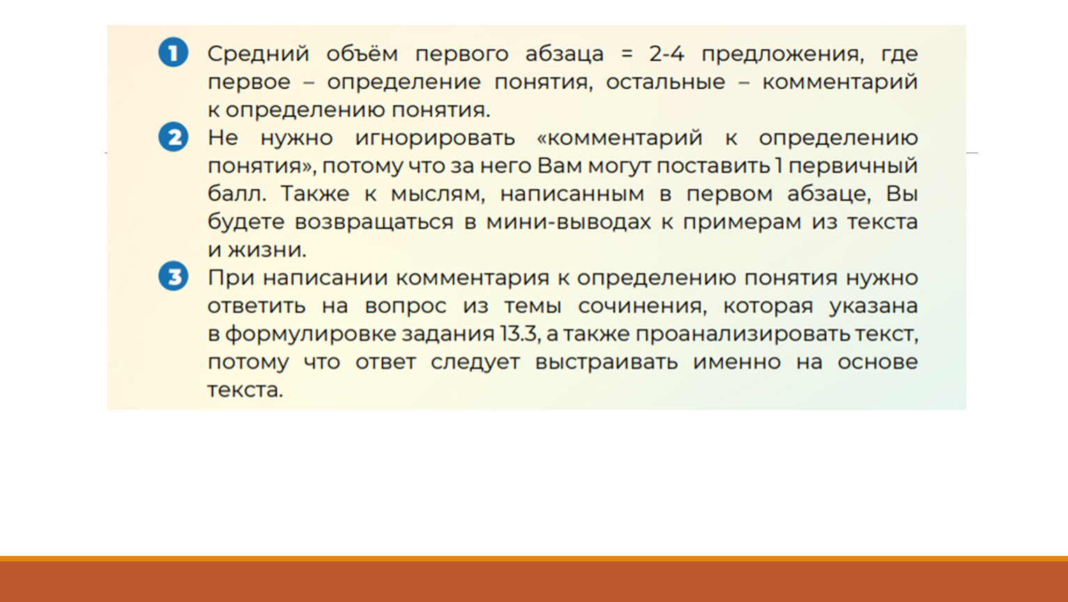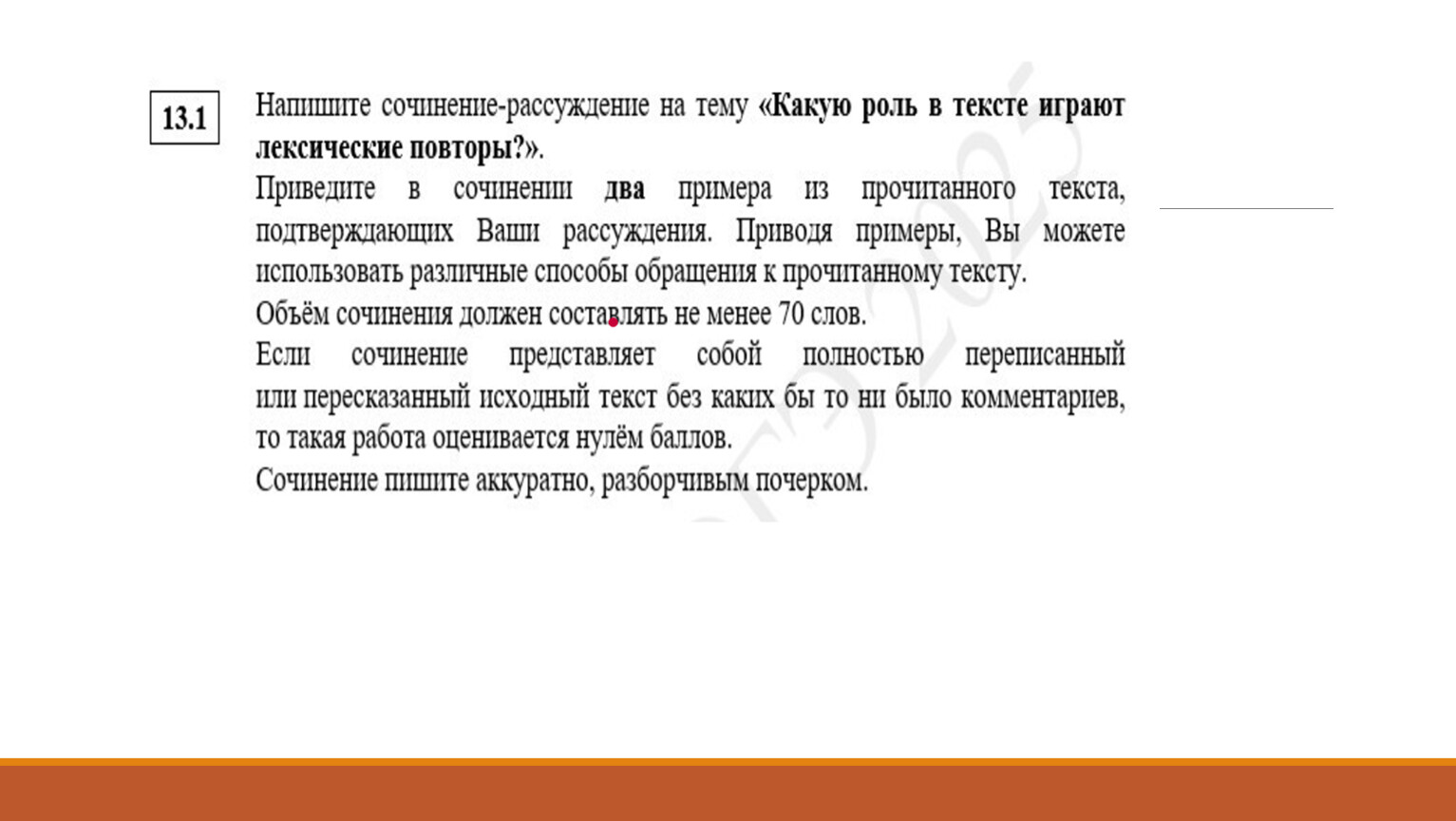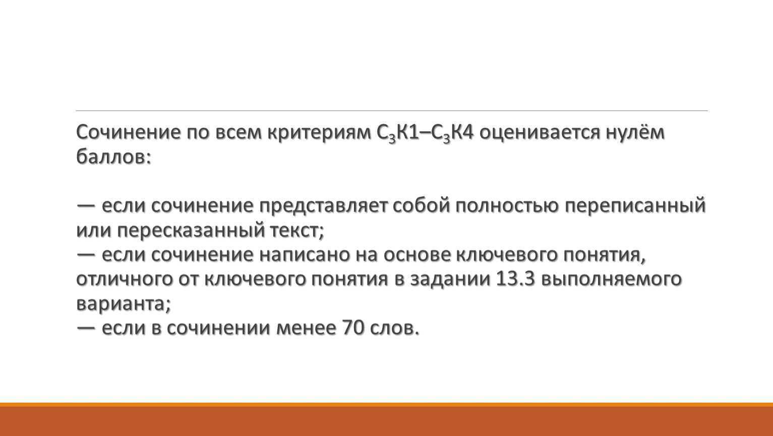 Сочинение по всем критериям С3К1–С3К4 оценивается нулём баллов:— если сочинение представляет собой полностью переписанный или пересказанный текст;— если сочинение написано на основе ключевого понятия, отличного от ключевого понятия в задании 13.3 выполняемого варианта;— если в сочинении менее 70 слов.