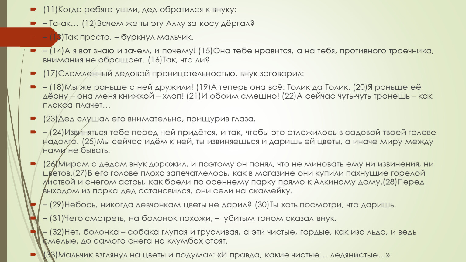 (26)Миром с дедом внук дорожил, и поэтому он понял, что не миновать ему ни извинения, ни цветов.(27)В его голове плохо запечатлелось, как в магазине они купили пахнущие горелой листвой и снегом астры, как брели по осеннему парку прямо к Алкиному дому.(28)Перед выходом из парка дед остановился, они сели на скамейку.