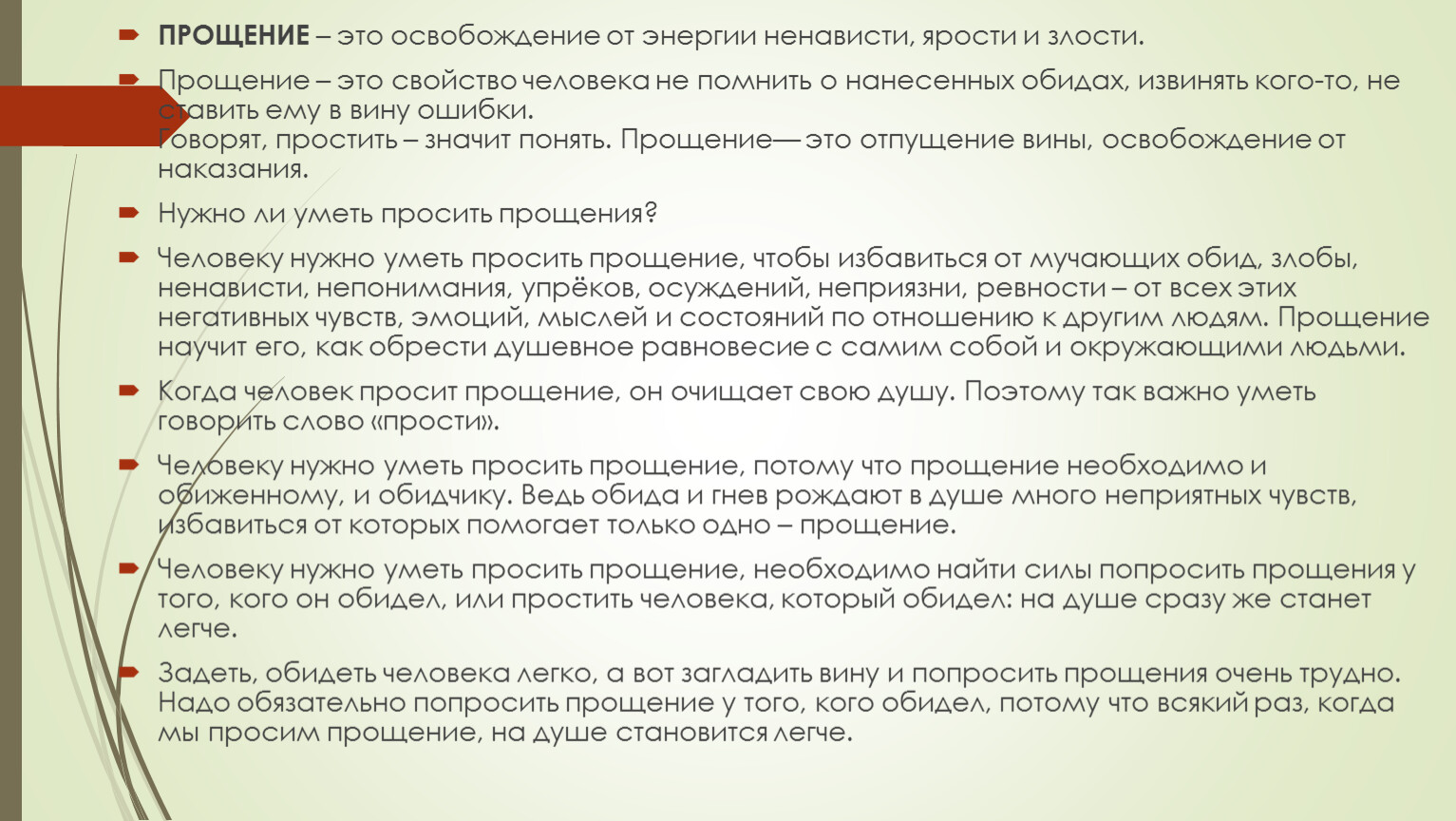 Человеку нужно уметь просить прощение, чтобы избавиться от мучающих обид, злобы, ненависти, непонимания, упрёков, осуждений, неприязни, ревности – от всех этих негативных чувств, эмоций, мыслей и состояний по отношению к другим людям. Прощение научит его, как обрести душевное равновесие с самим собой и окружающими людьми.