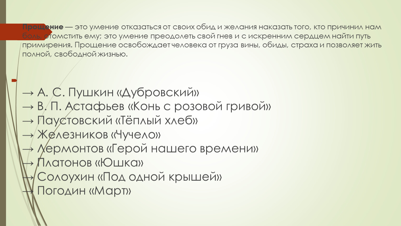 → А. С. Пушкин «Дубровский»→ В. П. Астафьев «Конь с розовой гривой»→ Паустовский «Тёплый хлеб»→ Железников «Чучело»→ Лермонтов «Герой нашего времени»→ Платонов «Юшка»→ Солоухин «Под одной крышей»→ Погодин «Март»