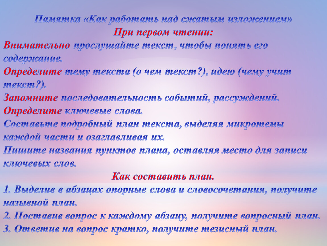 показать, как зависит выполнение сжатого изложения от точности понимания исходного текста;