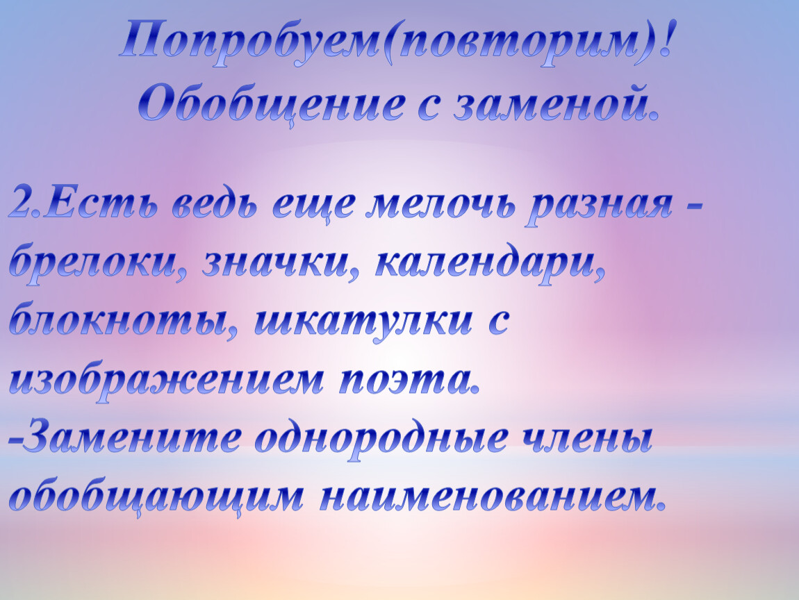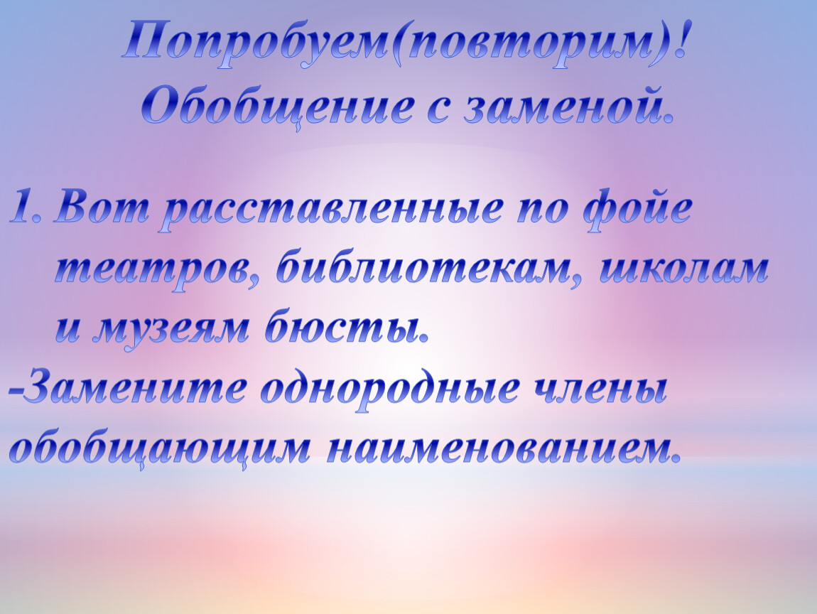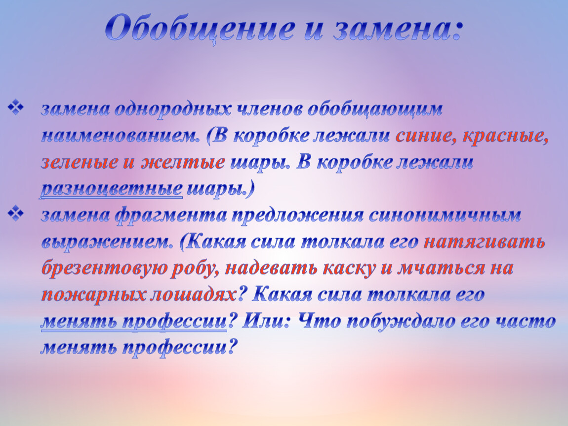 замена однородных членов обобщающим наименованием. (В коробке лежали синие, красные, зеленые и желтые шары. В коробке лежали разноцветные шары.)