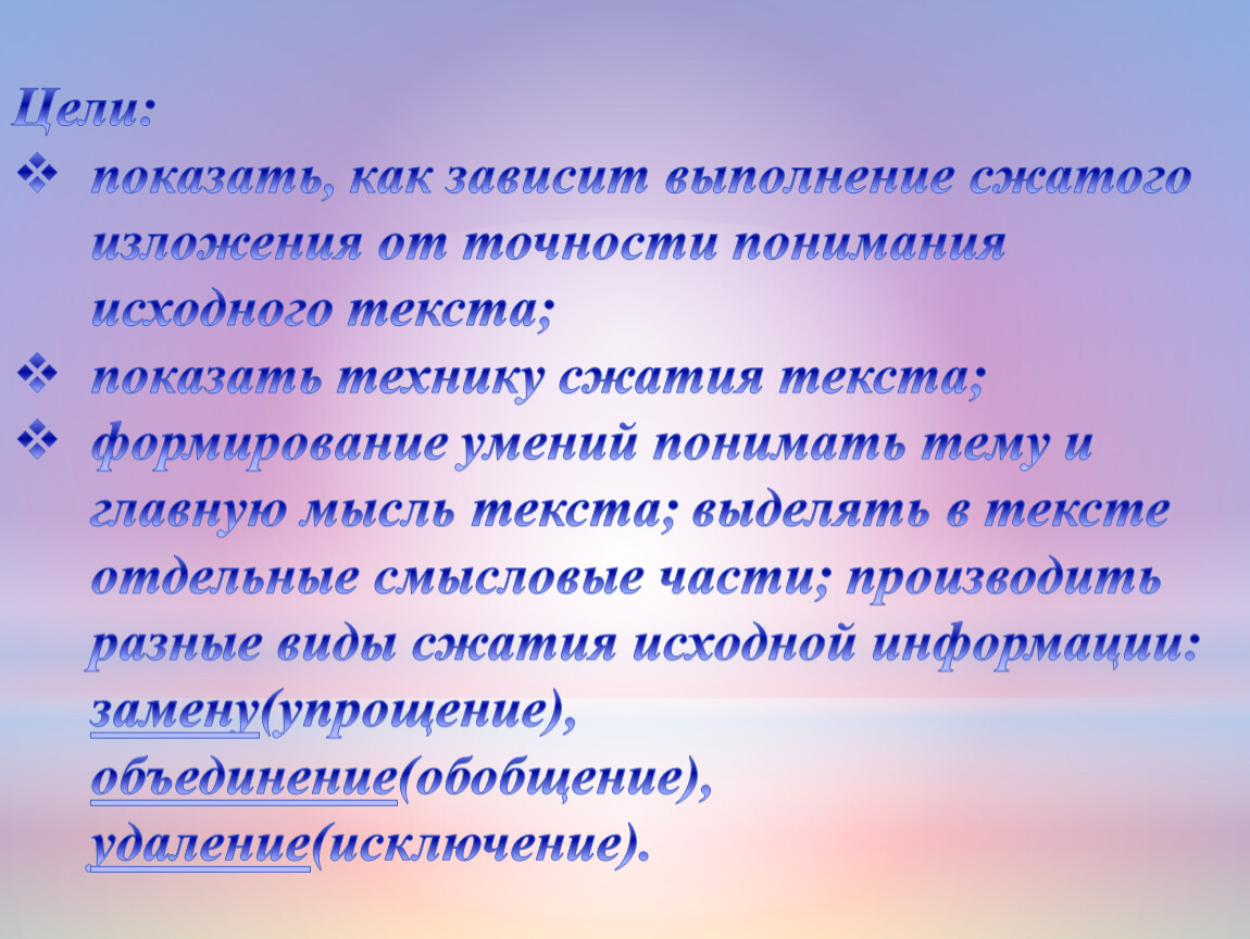 формирование умений понимать тему и главную мысль текста; выделять в тексте отдельные смысловые части; производить разные виды сжатия исходной информации: замену(упрощение), объединение(обобщение), удаление(исключение).