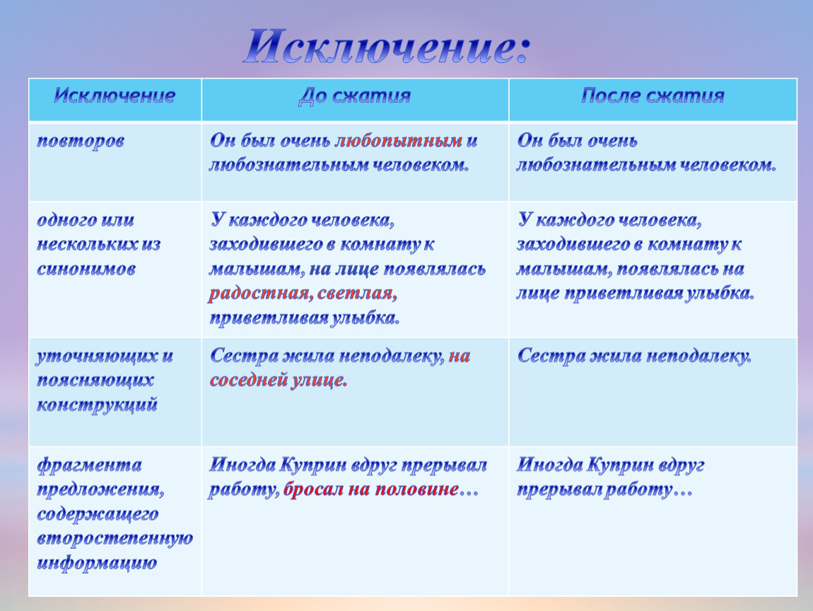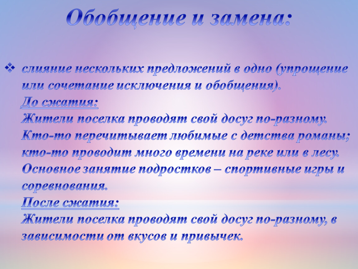 слияние нескольких предложений в одно (упрощение или сочетание исключения и обобщения). До сжатия: Жители поселка проводят свой досуг по-разному. Кто-то перечитывает любимые с детства романы; кто-то проводит много времени на реке или в лесу. Основное занятие подростков – спортивные игры и соревнования. После сжатия: Жители поселка проводят свой досуг по-разному, в зависимости от вкусов и привычек.