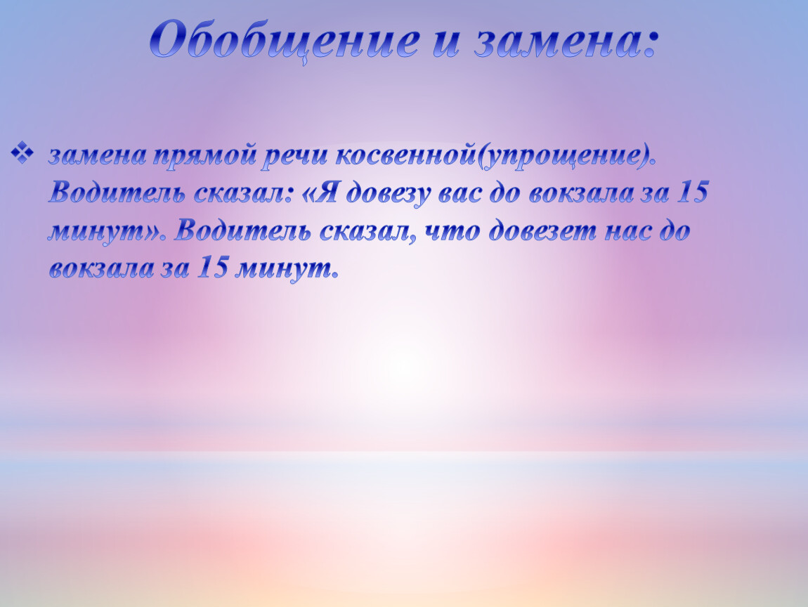 замена прямой речи косвенной(упрощение). Водитель сказал: «Я довезу вас до вокзала за 15 минут». Водитель сказал, что довезет нас до вокзала за 15 минут.