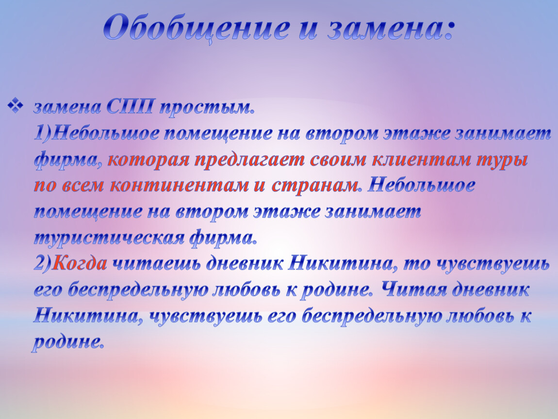 замена СПП простым. 1)Небольшое помещение на втором этаже занимает фирма, которая предлагает своим клиентам туры по всем континентам и странам. Небольшое помещение на втором этаже занимает туристическая фирма. 2)Когда читаешь дневник Никитина, то чувствуешь его беспредельную любовь к родине. Читая дневник Никитина, чувствуешь его беспредельную любовь к родине.