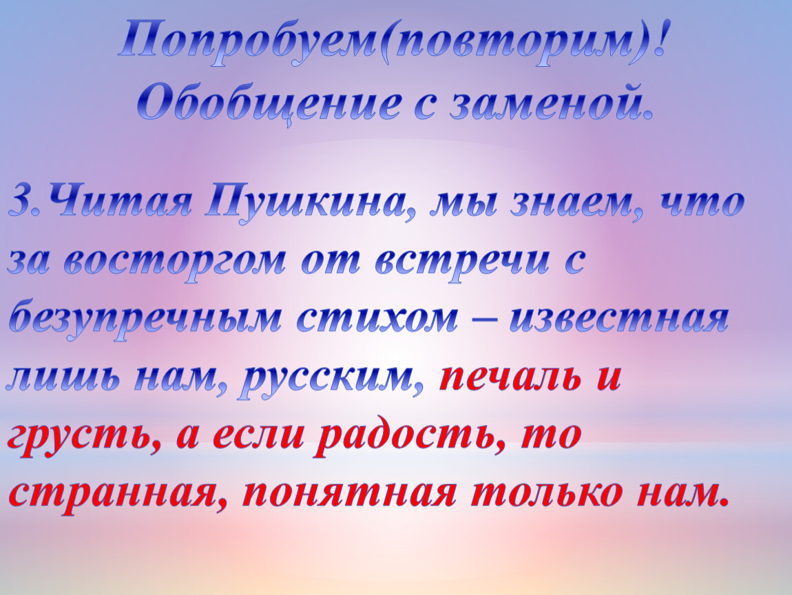3.Читая Пушкина, мы знаем, что за восторгом от встречи с безупречным стихом – известная лишь нам, русским, печаль и грусть, а если радость, то странная, понятная только нам.