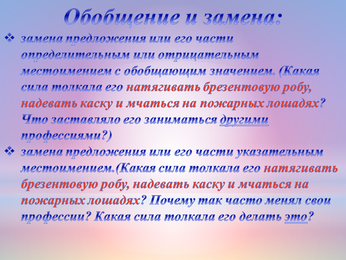 замена предложения или его части определительным или отрицательным местоимением с обобщающим значением. (Какая сила толкала его натягивать брезентовую робу, надевать каску и мчаться на пожарных лошадях? Что заставляло его заниматься другими профессиями?)