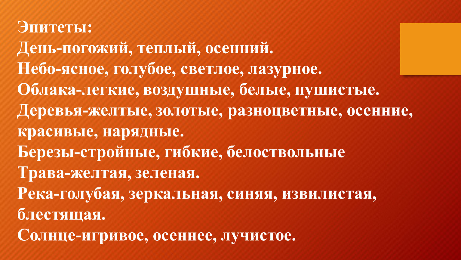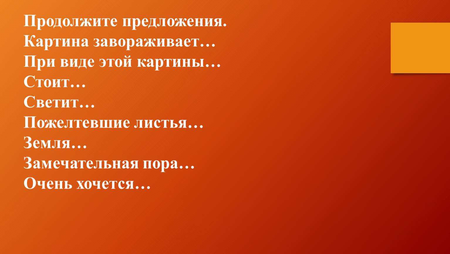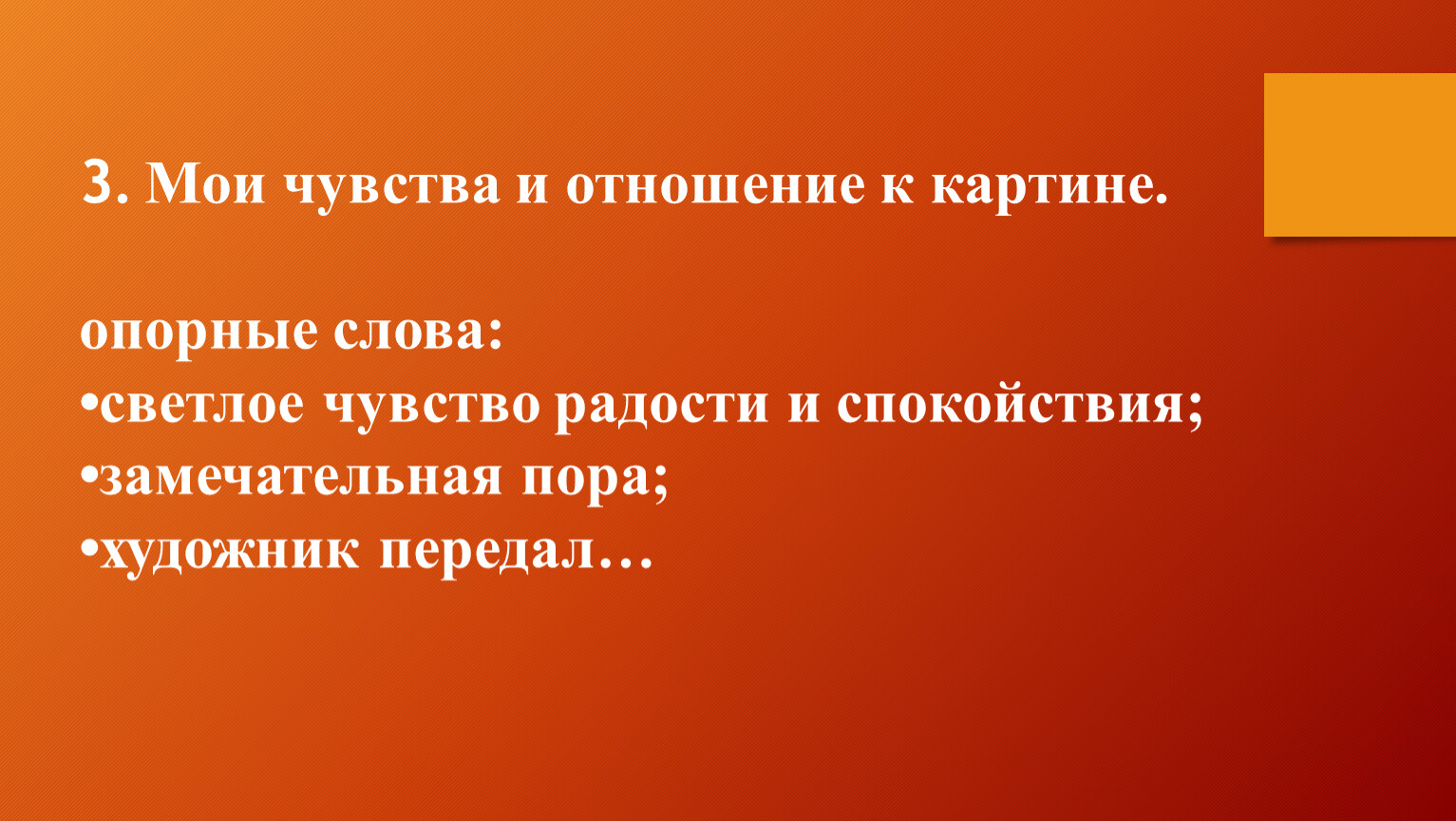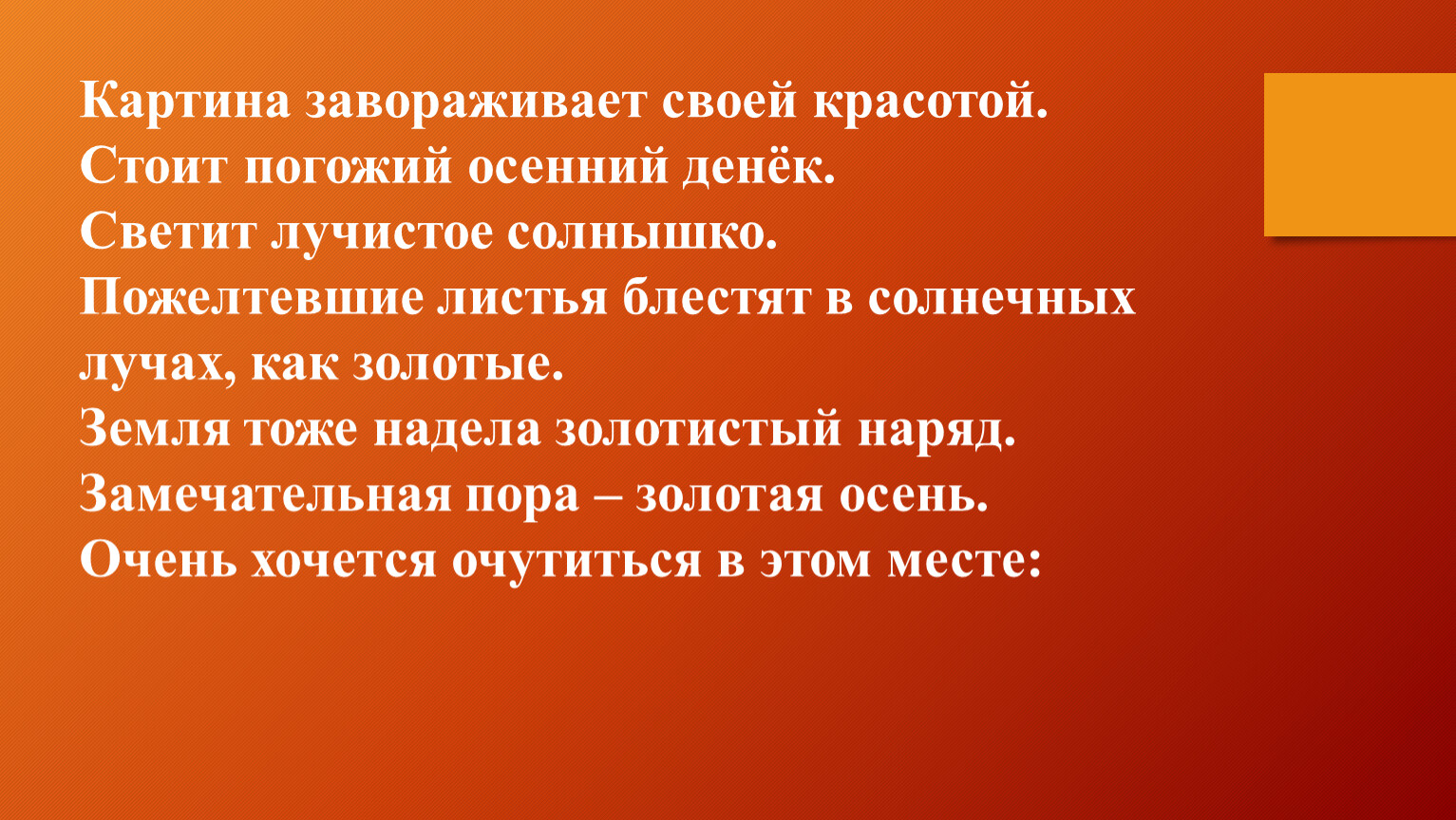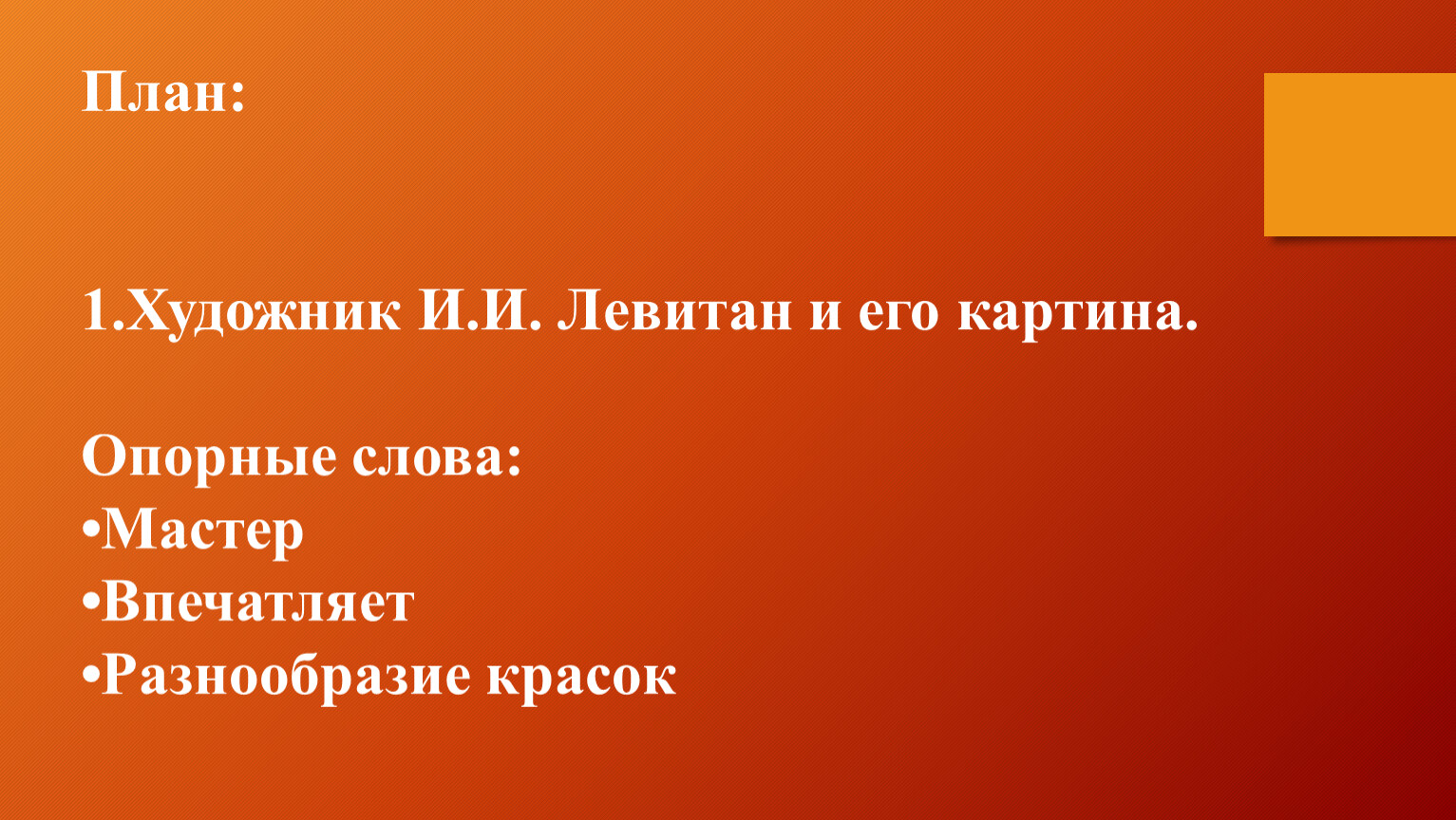 Цель: Познакомиться с творчеством И. И. Левитана, подготовиться к описанию осеннего пейзажа, формировать умение писать сочинение – описание апейзажной картины.