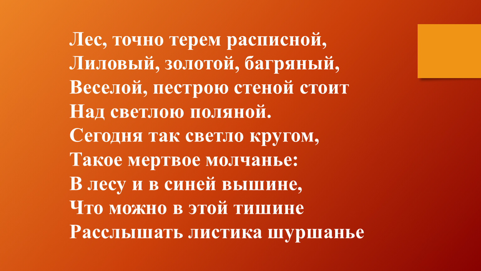 Лес, точно терем расписной, Лиловый, золотой, багряный, Веселой, пестрою стеной стоит Над светлою поляной.