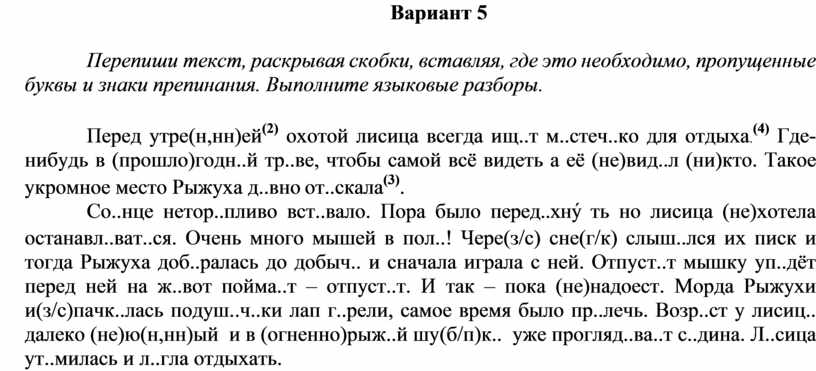 Перед утре(н,нн)ей(2) охотой лисица всегда ищ..т м..стеч..ко для отдыха.(4) Где-нибудь в (прошло)годн..й тр..ве, чтобы самой всё видеть а её (не)вид..л (ни)кто. Такое укромное место Рыжуха д..вно от..скала(3).