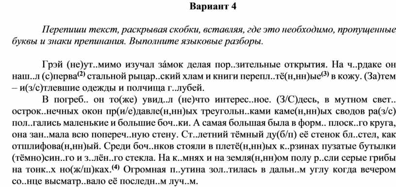 В погреб.. он то(же) увид..л (не)что интерес..ное. (З/С)десь, в мутном свет.. острок..нечных окон пр(и/е)давле(н,нн)ых треугольн..ками каме(н,нн)ых сводов ра(з/с) пол..гались маленькие и большие боч..ки. А самая большая была в форм.. плоск..го круга, она зан..мала всю попереч..ную стену. Ст..летний тёмный ду(б/п) её стенок бл..стел, как отшлифова(н,нн)ый. Среди боч..нков стояли в плетё(н,нн)ых к..рзинах пузатые бутылки (тёмно)син..го и з..лён..го стекла. На к..мнях и на земля(н,нн)ом полу р..сли серые грибы на тонк..х но(ж/ш)ках.(4) Огромная п..утина зол..тилась в дальн..м углу когда вечером со..нце высматр..вало её последн..м луч..м.