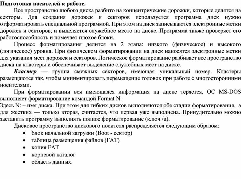 Процесс форматирования делится на 2 этапа: низкого (физическое) и высокого (логическое) уровня. При физическом форматировании на диск наносятся электронные метки для указания мест дорожек и секторов. Логическое форматирование разбивает все пространство диска на кластеры и обеспечивает выделение служебных мест на диске.