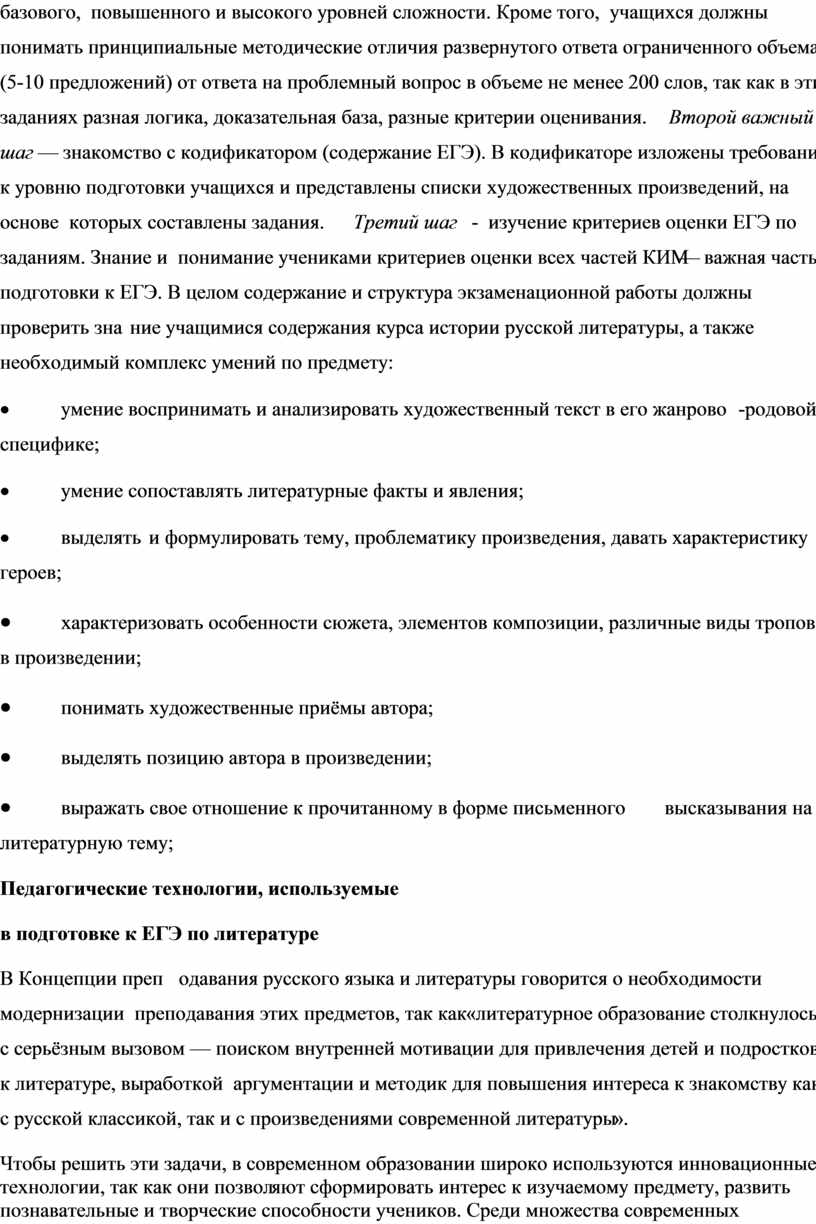 Чтобы решить эти задачи, в современном образовании широко используются инновационные технологии, так как они позволяют сформировать интерес к изучаемому предмету, развить познавательные и творческие способности учеников. Среди множества современных технологий наиболее приемлемыми в подготовке учащихся к ЕГЭ по литературе, на мой взгляд, являются: