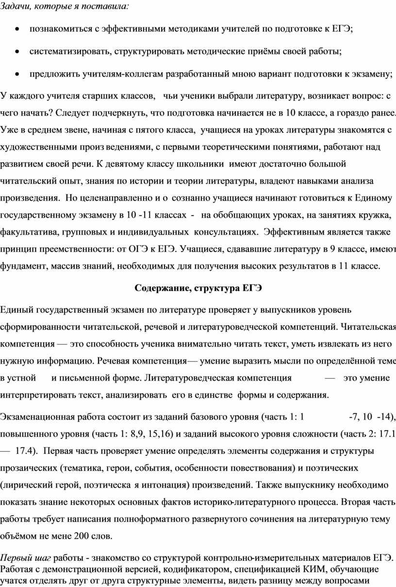 Первый шаг работы - знакомство со структурой контрольно-измерительных материалов ЕГЭ. Работая с демонстрационной версией, кодификатором, спецификацией КИМ, обучающие учатся отделять друг от друга структурные элементы, видеть разницу между вопросами базового, повышенного и высокого уровней сложности. Кроме того, учащихся должны понимать принципиальные методические отличия развернутого ответа ограниченного объема (5-10 предложений) от ответа на проблемный вопрос в объеме не менее 200 слов, так как в этих заданиях разная логика, доказательная база, разные критерии оценивания. Второй важный шаг — знакомство с кодификатором (содержание ЕГЭ). В кодификаторе изложены требования к уровню подготовки учащихся и представлены списки художественных произведений, на основе которых составлены задания. Третий шаг - изучение критериев оценки ЕГЭ по заданиям. Знание и понимание учениками критериев оценки всех частей КИМ— важная часть подготовки к ЕГЭ. В целом содержание и структура экзаменационной работы должны проверить знание учащимися содержания курса истории русской литературы, а также необходимый комплекс умений по предмету: