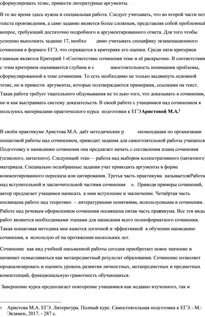 В то же время здесь нужна и специальная работа. Следует учитывать, что во второй части нет текста произведения, а само задание является более сложным, представляя собой проблемный вопрос, требующий достаточно подробного и аргументированного ответа. Для того чтобы успешно выполнить задание 17, необходимо учитывать специфику экзаменационного сочинения в формате ЕГЭ, что отражается в критериях его оценки. Среди пяти критериев главным является Критерий 1 «Соответствие сочинения теме и её раскрытие». В соответствии с этим критерием оцениваются глубина и самостоятельность понимания проблемы, сформулированной в теме сочинения. То есть необходимо не только выдвинуть основной тезис, но и привести аргументы, которые подтверждаются примерами, ссылками на текст. Такая работа требует тщательного обдумывания не только того, что доказывать в сочинении, но и как выстраивать систему доказательств. В своей работе с учащимися над сочинением я пользуюсь материалами практического курса подготовки к ЕГЭ Аристовой М.А.[3]
