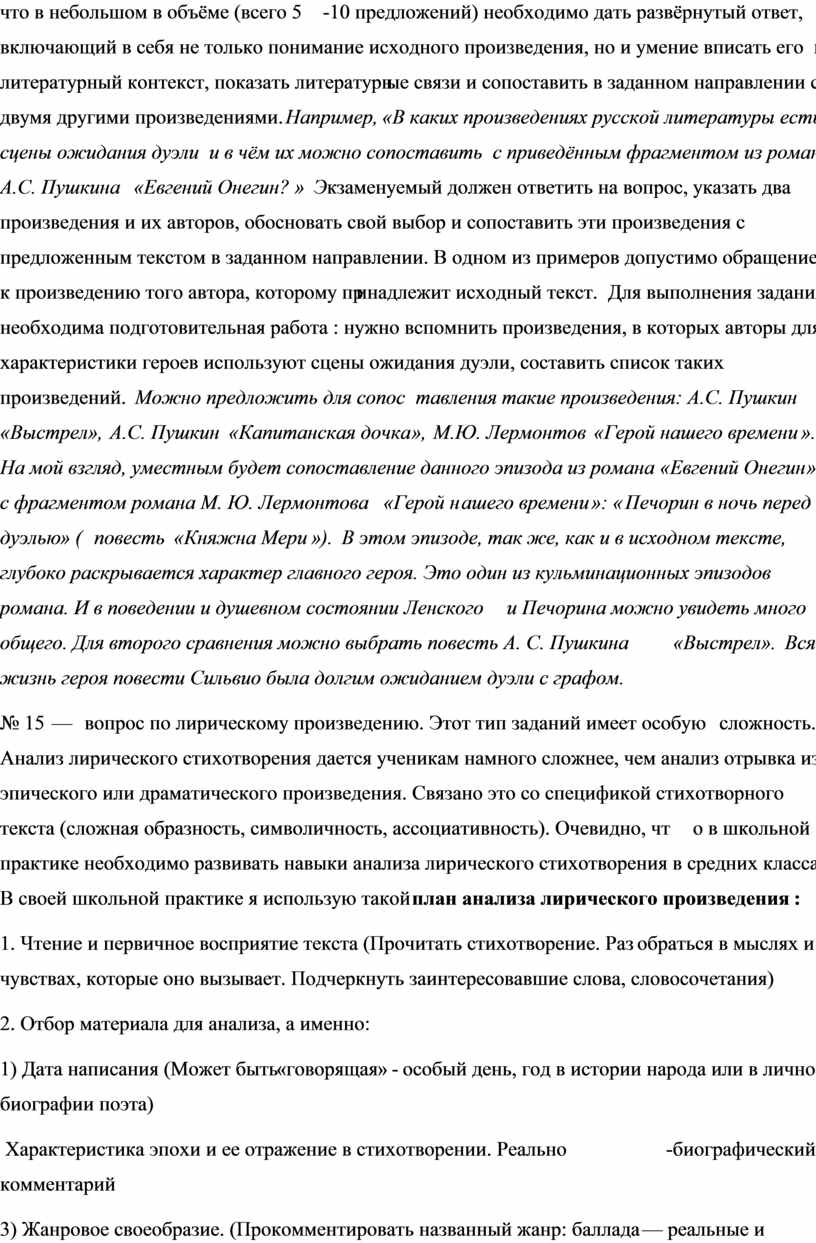 6. № 15 — вопрос по лирическому произведению. Этот тип заданий имеет особую сложность. Анализ лирического стихотворения дается ученикам намного сложнее, чем анализ отрывка из эпического или драматического произведения. Связано это со спецификой стихотворного текста (сложная образность, символичность, ассоциативность). Очевидно, что в школьной практике необходимо развивать навыки анализа лирического стихотворения в средних классах. В своей школьной практике я использую такой план анализа лирического произведения :