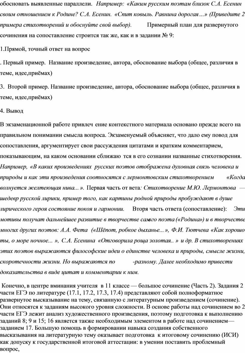 2. Другой тип задания требует назвать авторов и произведения, соотносящиеся с проанализированным текстом тематически, образно, эмоционально, а далее самостоятельно обосновать выявленные параллели. Например: «Каким русским поэтам близок С.А. Есенин своим отношением к Родине? С.А. Есенин. «Спит ковыль. Равнина дорогая…» (Приведите 2 примера стихотворений и обоснуйте свой выбор). Примерный план для развернутого сочинения на сопоставление строится так же, как и в задании № 9: